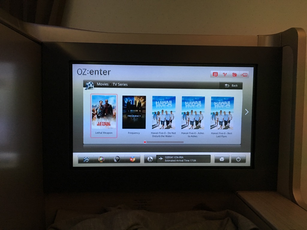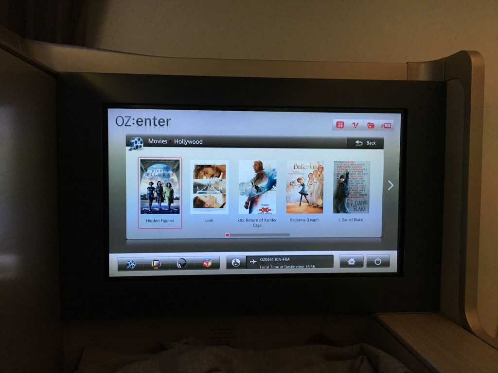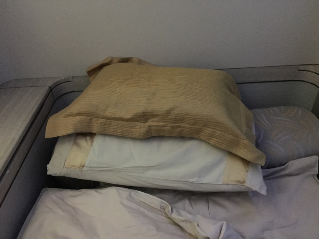 Auch die Decke und das Kissen waren in meinen Augen viel zu klein. Besonders die Decke war nur in etwa so breit wie der Sitz, wodurch man sich nicht richtig einmummeln kann. Andere Airlines bieten Bettzeug in der First Class, welches an das in guten Hotels erinnert. Hier hat Asiana leider Nachholbedarf in der Fist Class.