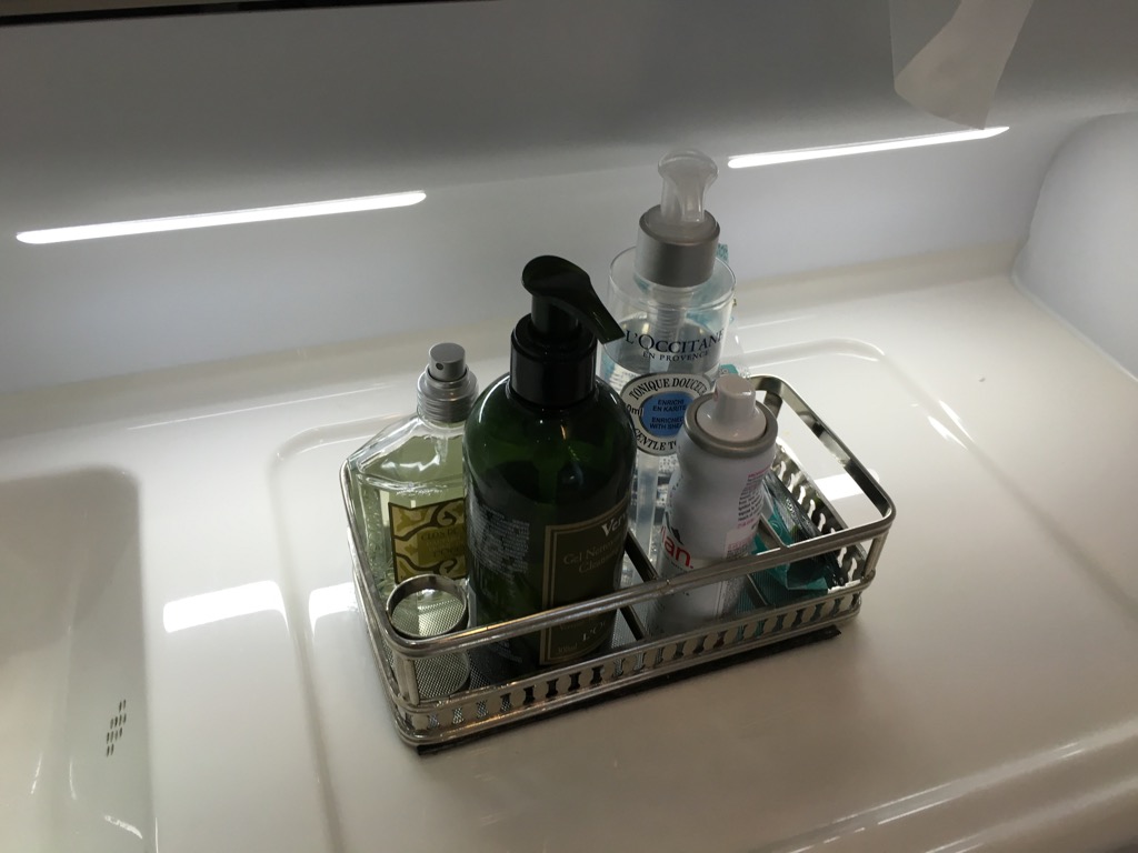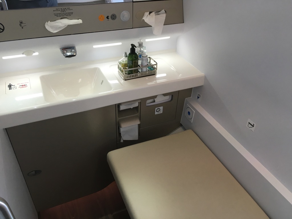 Das Badezimmer selbst ist angenehm groß und verfügt neben einer Sitzbank zum Umziehen auch über Fenster. Auch eine ganze Reihe von Amenitys standen im Bad bereit. Das Badezimmer war auch den ganzen Flug über in einem tadellosen Zustand.