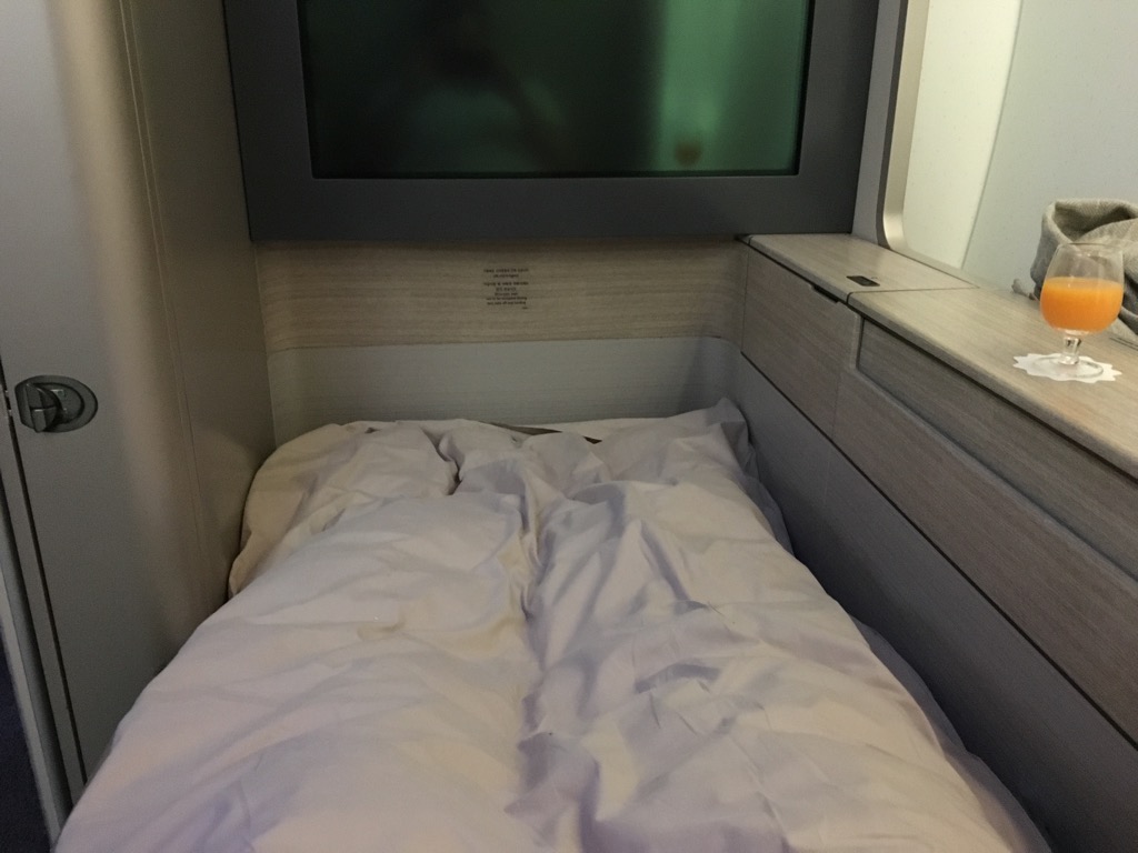 Nach dem gefühlt 18 gängigen Menü bat ich die Flugbegleiterin mir das Bett zu machen, während ich mich im Bad fertig machte. Das Bett in der Asiana First Class im Airbus A380 ist leider mein größter Kritikpunkt an dem gesamten Flug. Die aufgelegte Matratze ist leider nur wenige Millimeter dick und gleicht damit die Unebenheiten des Sitzes kaum aus.