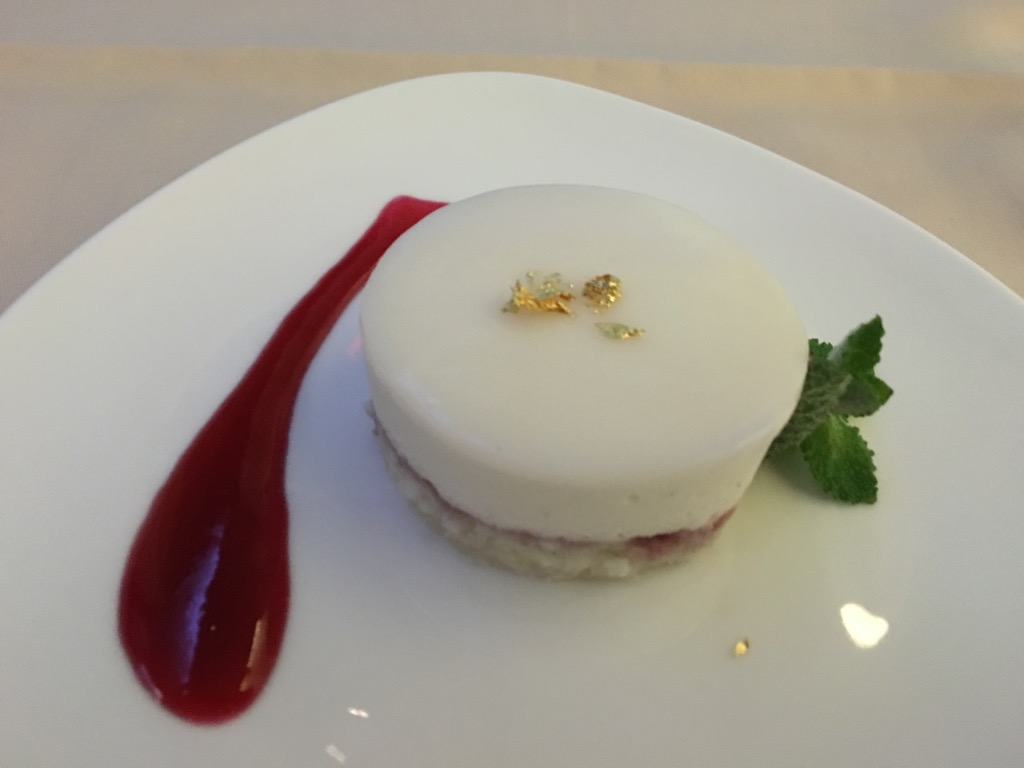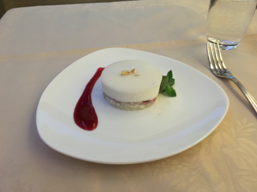 Das kleine Törtchen zum Dessert rundete das Essen ab. Mit dem Blattgold zeigte man optisch sehr deutlich, dass man in der First Class unterwegs ist.