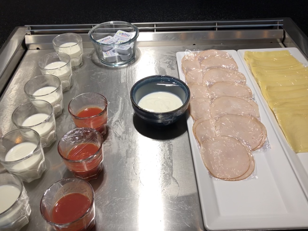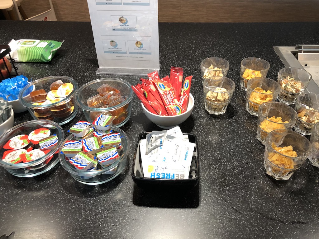 Das Angebot ähnelt dem der Lounge bei Schengen. Es gab morgens keine warmen Optionen, Croissants und Obst waren portioniert und abgepackt. Auch Aufschnitt und Käse waren scheibenweise in Folie gewickelt.