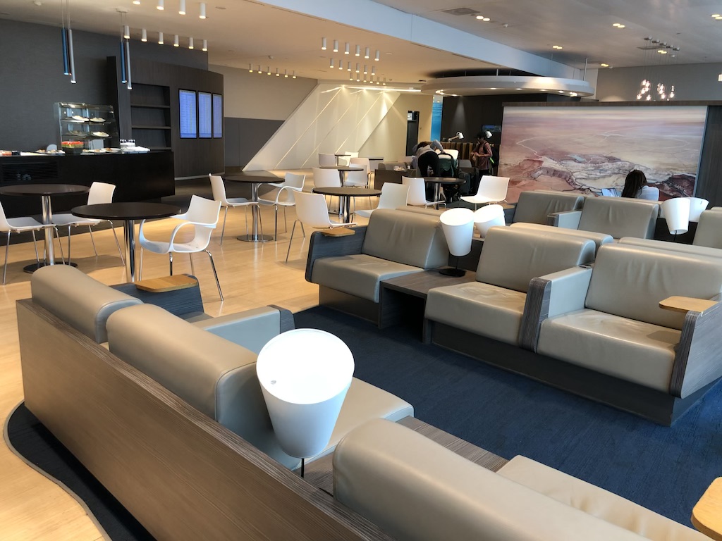 Gegenüber der Rezeption befindet sich schon der erste Sitzbereich in moderner und heller Optik. Danach gelangt man in den Hauptteil, der aus einem großen Raum aus gewaltigen Fensterfronten besteht. Der Blick auf das Vorfeld ist ein dickes Plus und sorgt für eine gelungene Einstimmung auf den Flug.