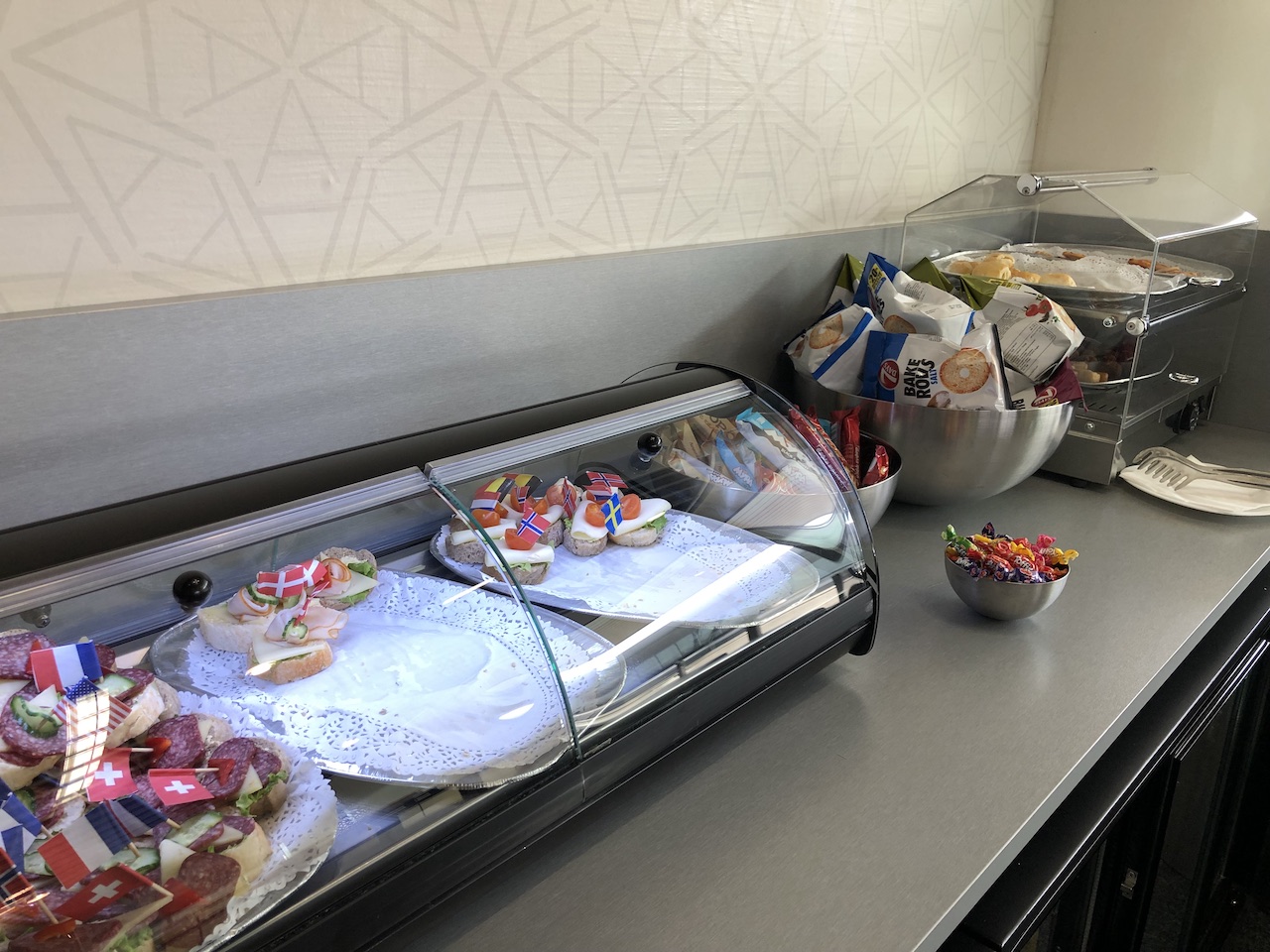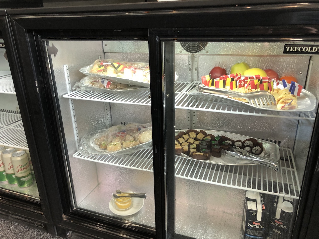 Es stehen Sandwiches, Knabberzeug und Obst zur Selbstbedienung. Einige Snacks wie Fleischbällchen und gefüllte Teigtaschen waren in einer Warmhaltebox.