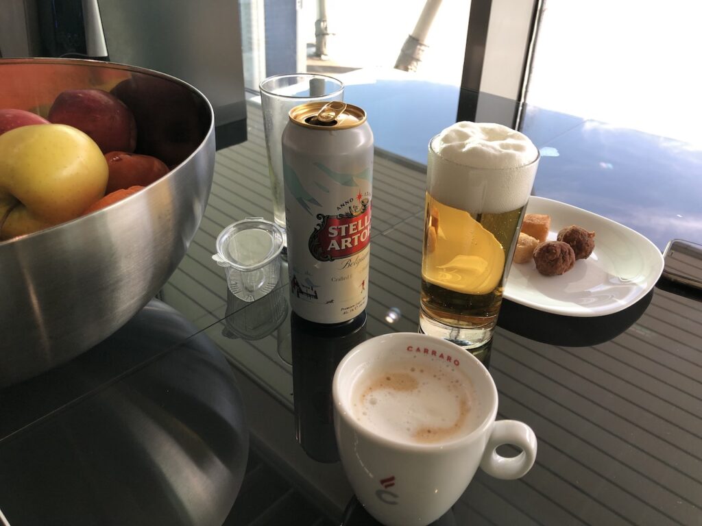 Das Cateringangebot ist jetzt nicht herausragend, hängt aber ähnliche Lounges ab. Für Premium-Gäste verschiedener Airlines ist das Angebot etwas mager, für die 10€ Eintritt kann sich das Sortiment aber durchaus sehen lassen. Selten lohnt sich der Aufpreis für eine Lounge, in diesem Fall relativiert sich die niedrige Gebühr schnell. Die öffentlichen Bars, Cafes und Restaurants im Terminal sind allerdings auch nicht überteuert.