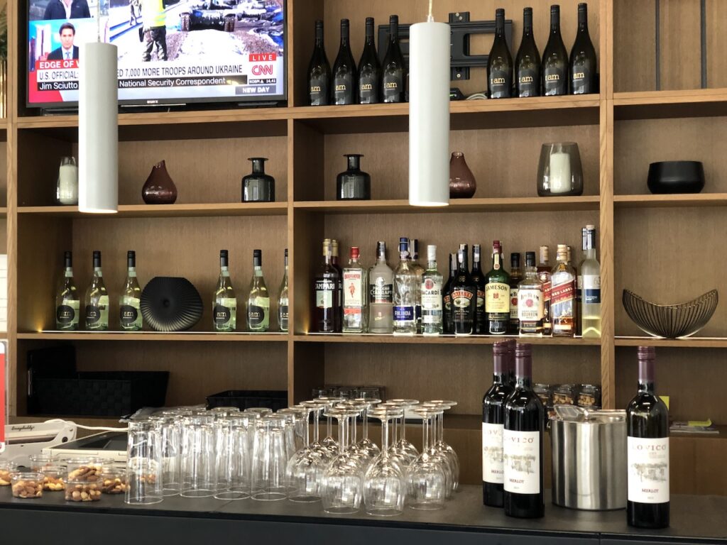 An der Bar gibt es diverse Alkoholika und Wein, an Bier und Nüssen können sich Gäste selbst bedienen.