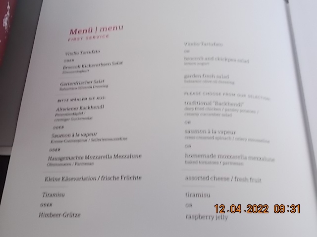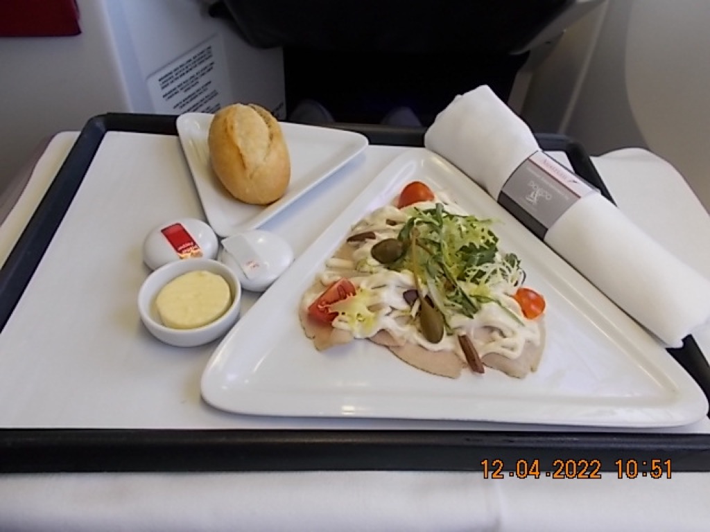 Nach Erreichen der Reiseflughöhe wurde zügig mit dem Service bekommen. Zuerst wurden heiße Tücher verteilt. Eine Getränkerunde mit Nüssen gab es nicht, sondern man konnte direkt vom Trolley die Vorspeise und die Getränke auswählen. Ich entschied mich für Mineralwasser, ein Bier und einen Weißwein, den man mich auch probieren ließ. Während des Essens wurden stets Getränke nachgeschenkt, Brot nachgereicht und gefragt, ob alles zu meiner Zufriedenheit sei. Zusammen mit dem Purser führten zwei weitere Flugbegleiterinnen den Service durch. Als Hauptgericht wählte ich Lachs mit Spinat. Zum Dessert fragte ich nach Tiramisu und Käse und ich bekam noch frische Früchte.