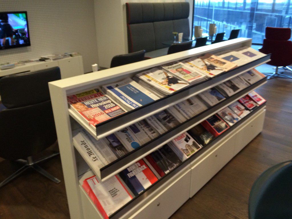 Neben einer großen Auswahl an Tageszeitungen und Zeitschriften gibt es eine TV-Area, welche ein wenig Wohnzimmercharakter hat.
