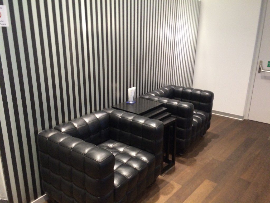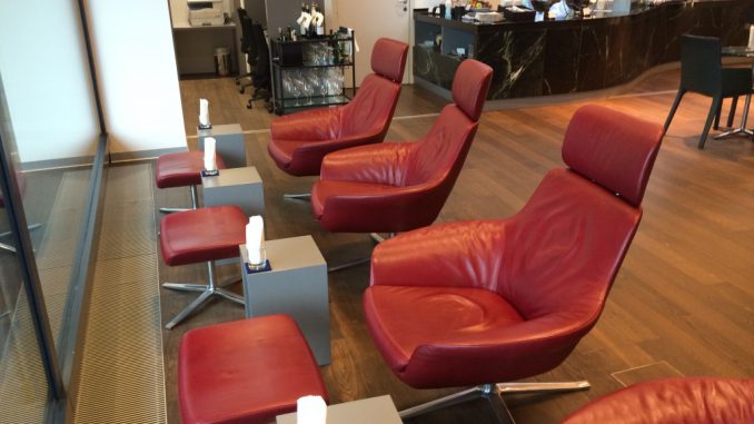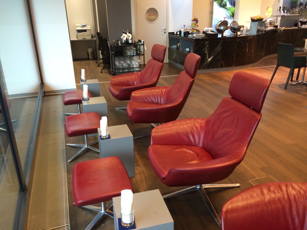 An der Fensterfront mit Vorfeldblick stehen Sessel mit Ottomanen, wie man sie aus den Lufthansa First Class Lounges kennt, bereit. Wie auch im Lufthansa First Class Terminal Frankfurt sind diese mein Lieblingsplatz in dieser Lounge.