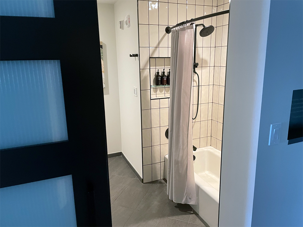 Das Bad ist riesig und bietet vor allem Platz. Die Toilette und der Waschtisch verbrauchen nicht viel Fläche und die kombinierte Badewanne mit Dusche ebenso wenig. Hier wird also viel Platz für Freifläche im Badezimmer hergeschenkt. Das Baddesign mit dem unverputzten Beton und den weißen Fliesen mit schwarzen Fugen fand ich ansprechend. Richtig beeindruckend ist die Ausstattung mit Duschgel, Shampoo und Conditioner in der Dusche, sowie mit Handseife, Gesichtsseife und Körpercreme am Waschtisch. Die Produkte kamen allesamt aus großen Spenderflaschen und waren angenehm.