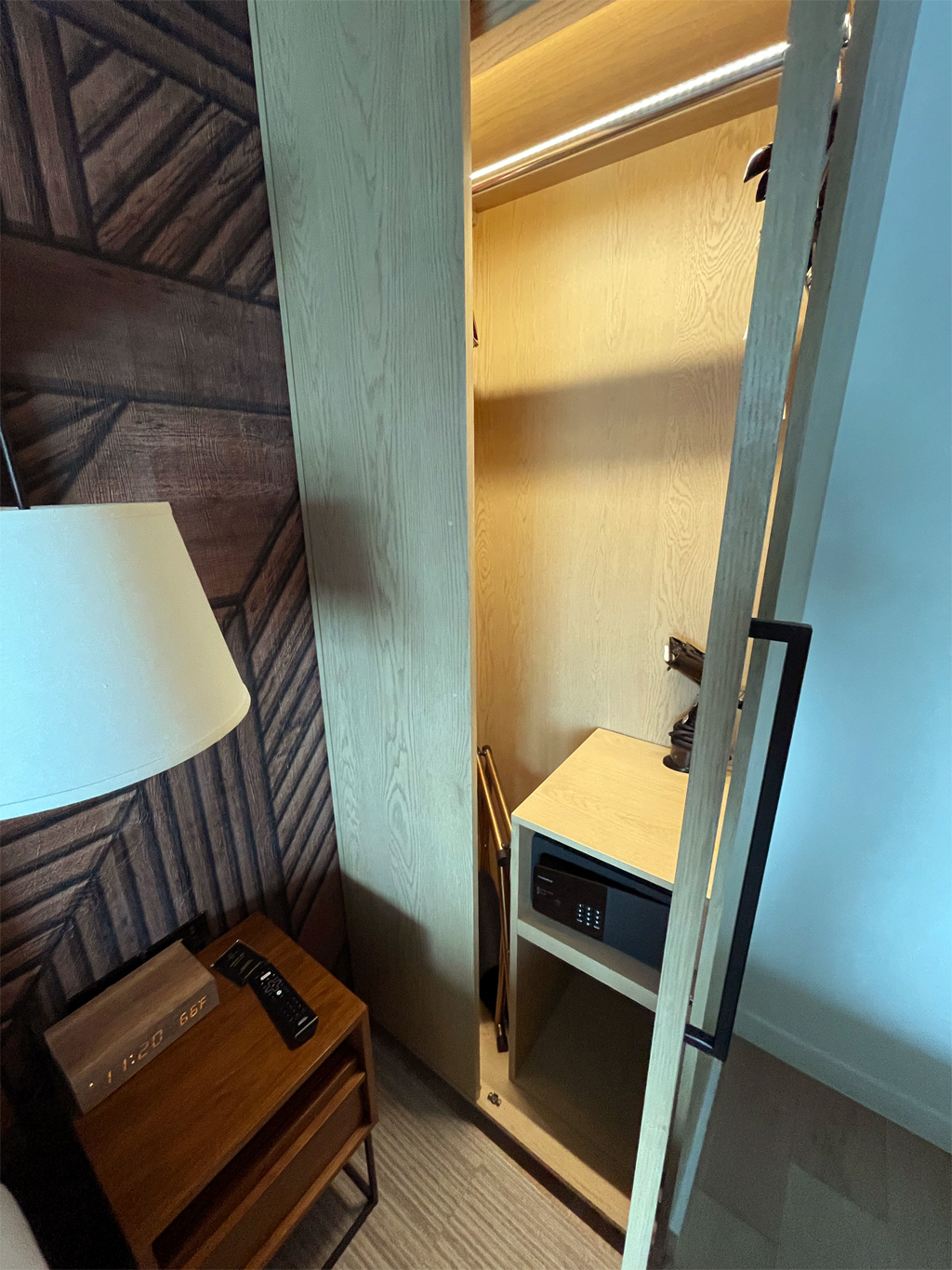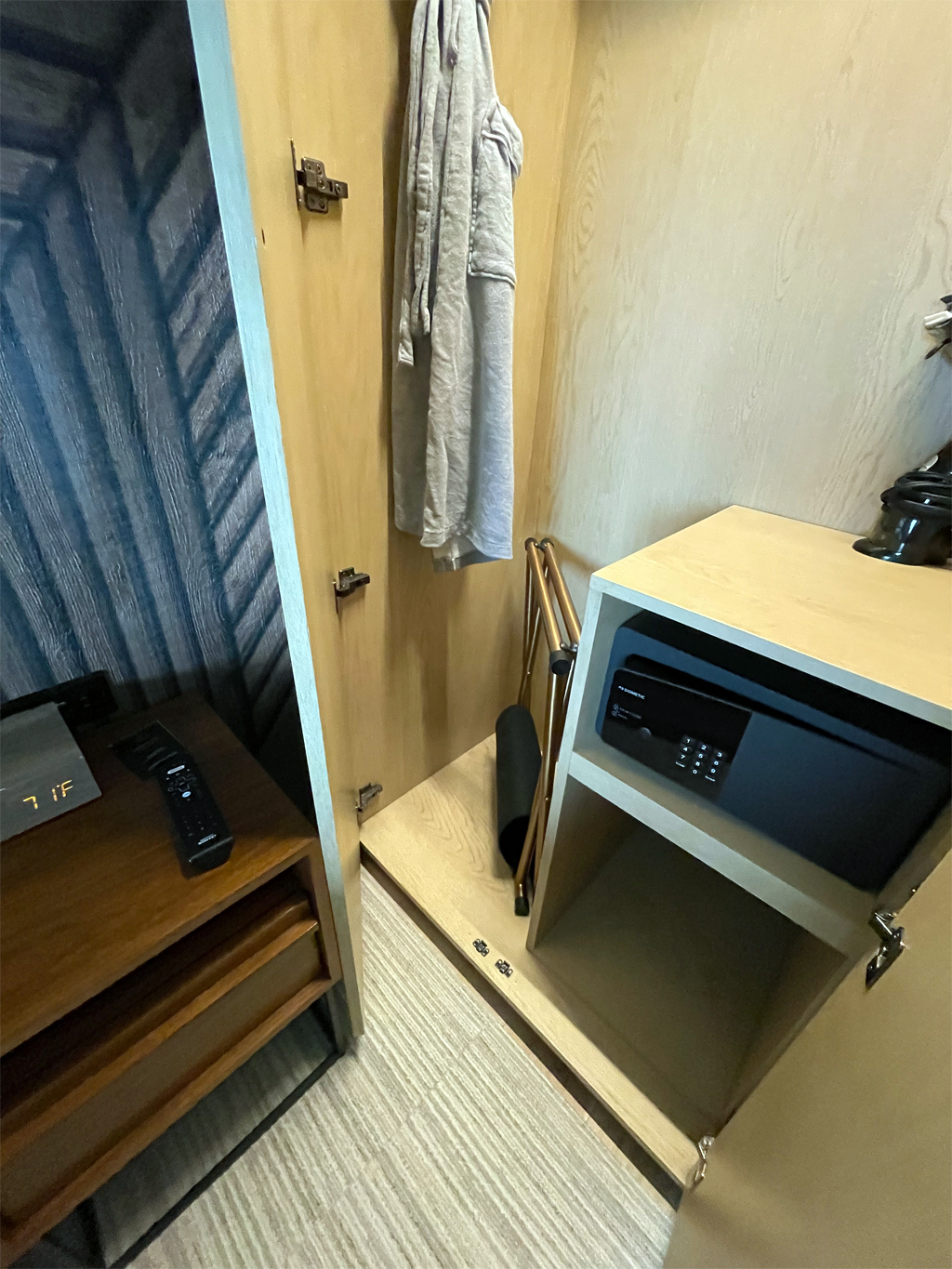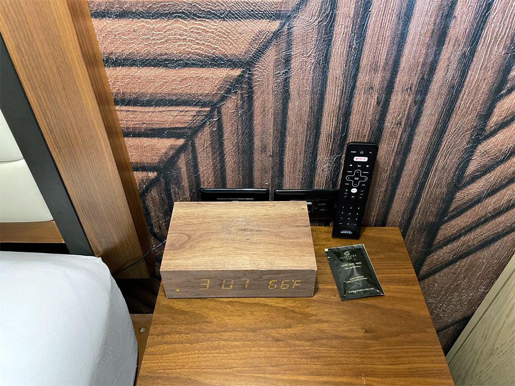 Im Hauptraum des Zimmers dominieren das große Bett und der Fernseher. Der Schreibtisch ist etwas klein geraten und wirkt irgendwie neben den Fernseher hingequetscht. Neben dem wirklich großen Bett befinden sich noch Nachttische. Natürlich mit Radio- und Bluetoothwecker. Soweit so gut. Es gibt natürlich einen Kleiderschrank. Der befindet sich in der Wand neben dem Bett. Darin befinden sich ein Bügelbrett und ein Bügeleisen. Nur leider lässt sich dessen Tür kaum öffnen, da der Nachtschrank im Weg steht. Die Kratzer an der Tür und dem Nachtschrank sprechen Bände.