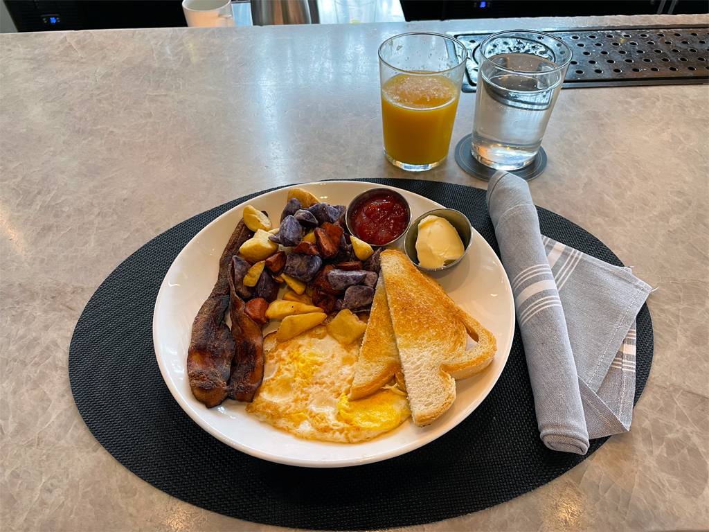Statt der 1.000 Punkte entschied ich mich beim Check-in für das Gratisfrühstück. Mir wurde bei einem Anruf vorab mitgeteilt, dass ich das „Bacon & Egg“ Frühstück erhalten könne. Entsprechend dem Vorgehen bei vielen US-Hotels ging ich von einem Buffet o.ä. aus, wobei ich mit „Bacon & Egg“ dann auch warme Gerichte am Buffet nehmen dürfe oder extra bestellen könnte.