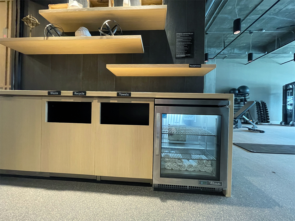 In einem kleinen Kühlschrank im Eingangsbereich liegen gekühlte Handtücher bereit. Nur Wasser suchte ich vergebens. Fast. Neben dem Kühlschrank befindet sich ein Schrank. Dieser war nicht abgeschlossen. Also öffnete ich ihn und fand eine Palette „Hotelwasser“ darin. Geht doch.