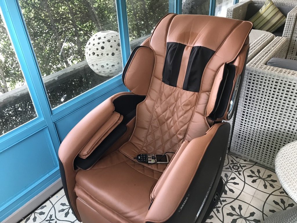 Die Lounge bestand aus einem großen Raum, der optisch in zwei Teile unterteilt ist. Der komplette Raum war mit Tischen, Stühlen und Couchmöbeln ausgestattet. Einzige Ausnahme stellte der Massagesessel dar, den ich natürlich ( 😉 ) mal testen musste.