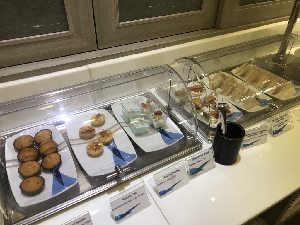 In der Lounge gab es ein kleines Buffet mit allerlei Snacks. Die Auswahl war hier für die Größe beachtlich. Ebenso wurde uns direkt nachdem wir Platz genommen hatten eine Speisekarte gebracht, aus der wir weitere Speisen und Getränke bestellen konnten. Da das Frühstück im Hotel uns nicht ansprach, hatten wir Hunger und haben uns etwas bestellt. Die Qualität und die Menge der Speisen und Getränkewar gut, wenn auch nicht überragend.
