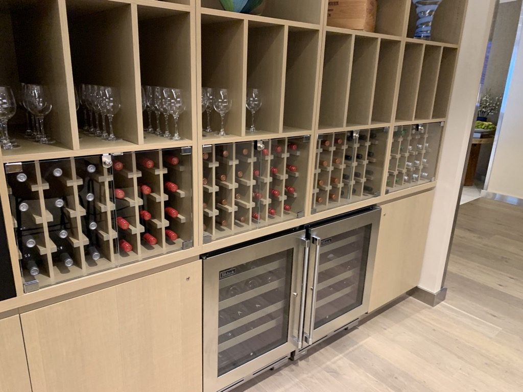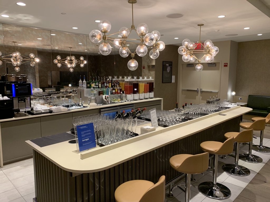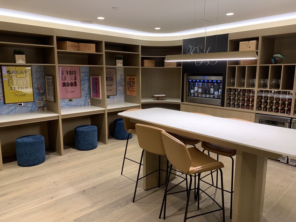 Im hinteren Bereich der Lounge befindet sich die Bar der British Airways First Class Lounge, welche zwar wie eine normale Bar aussieht, allerdings ist diese nicht bedient und im Wesentlichen ein Buffet für Getränke, an welchen sich die Gäste selbst bedienen können.