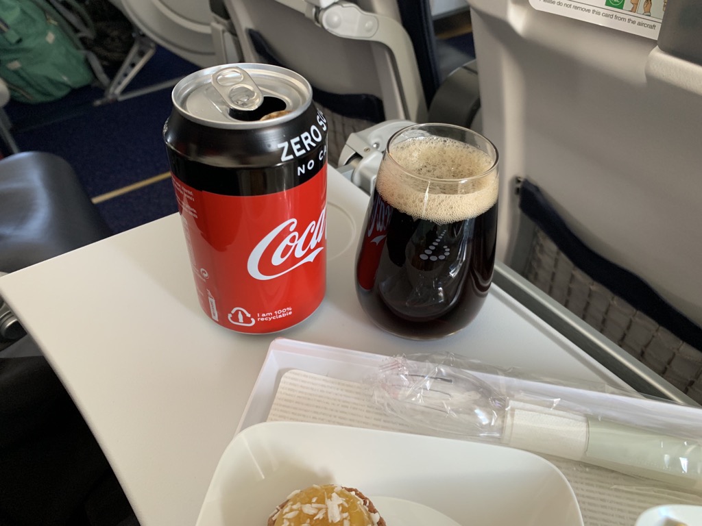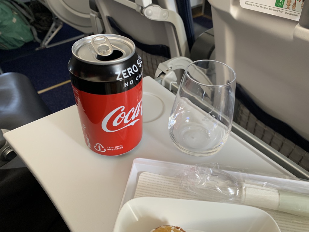 Zum Essen wurde natürlich auch ein Getränk gereicht, dabei hat man freie Auswahl aus der gesamten Bordbar. Ich habe eine Cola Zero bestellt, welche mir in einer 330ml Dose und einem Glas gebracht wurde.