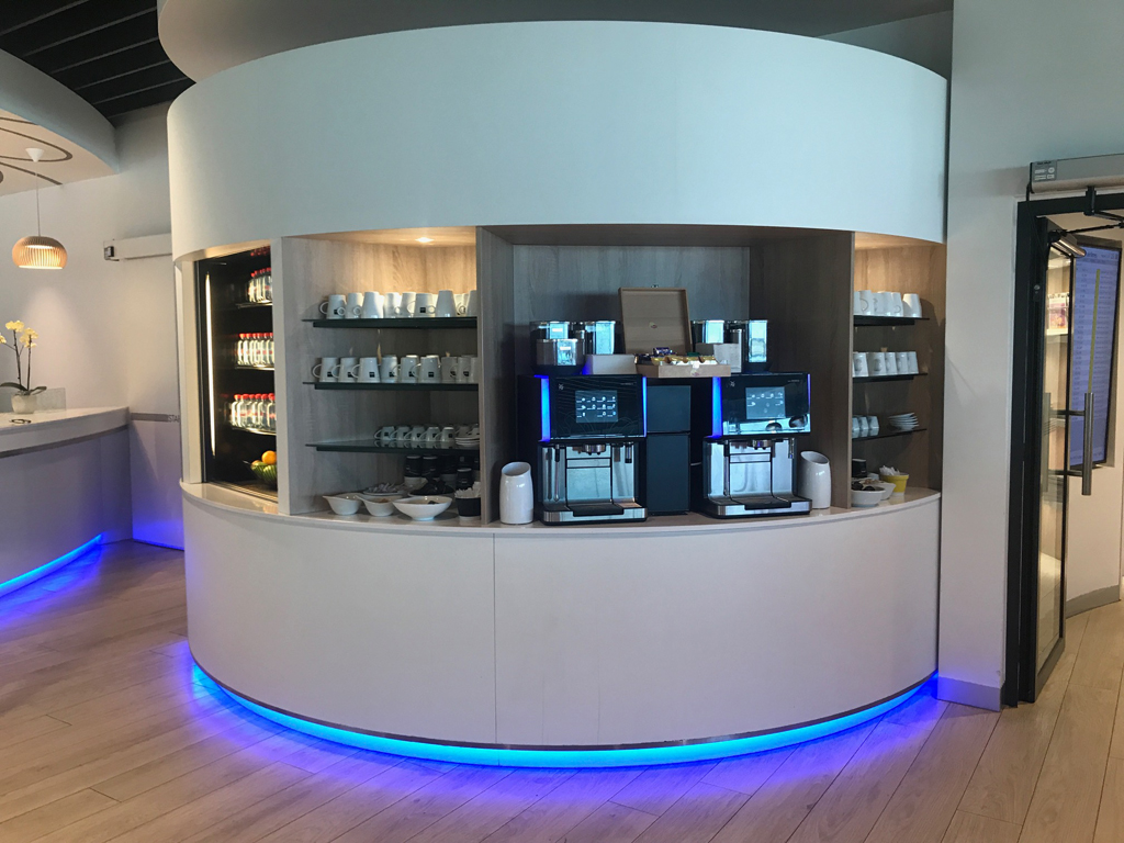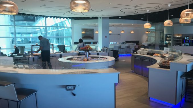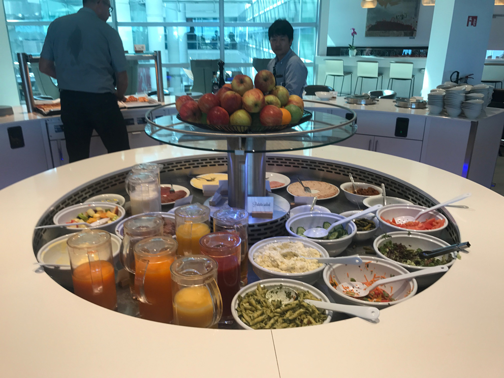 Direkt nach der Rezeption gelangt man in den Catering-Bereich der Lounge, der in mehreren Stationen aufgebaut ist. Unter anderem gibt es eine „zentrale“ Kaffeestation, an der es diverse Heißgetränke gibt. Danach folgen zwei Essensstationen, die ich im nächsten Teil dieses Artikels, der sich mit dem Catering beschäftigt, zeigen werde.