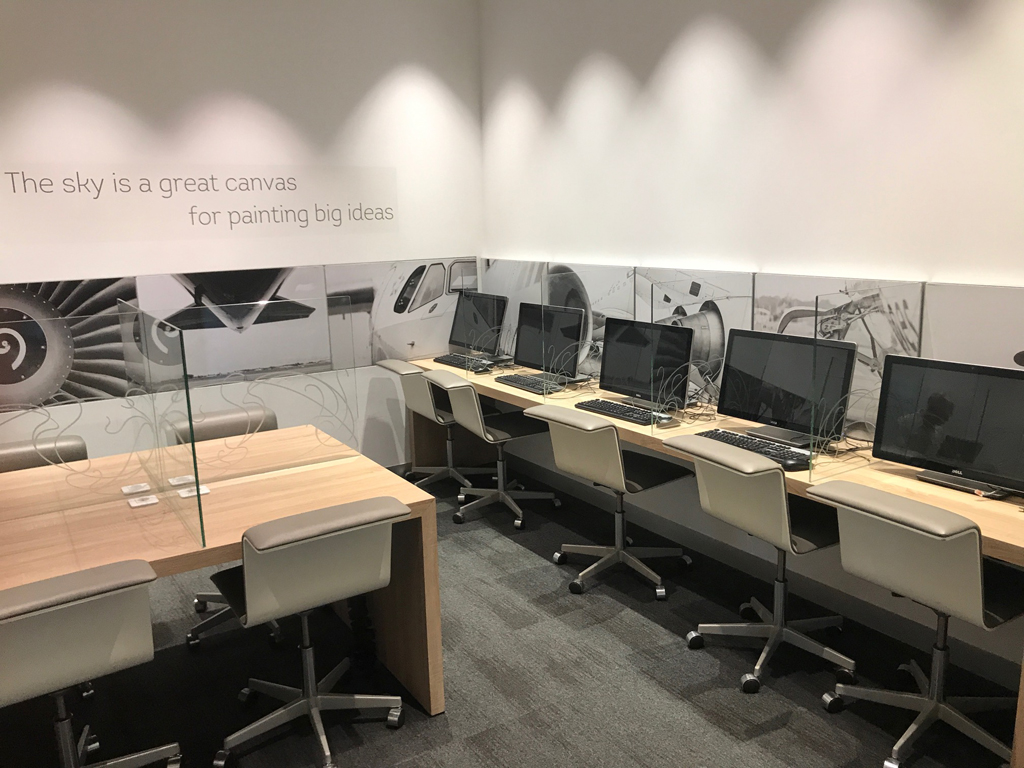 Auch ein großes Arbeitszimmer mit mehreren Computerarbeitsplätzen und zwei schalldichten Telefonkabinen gehört zum Interieur der Lounge: