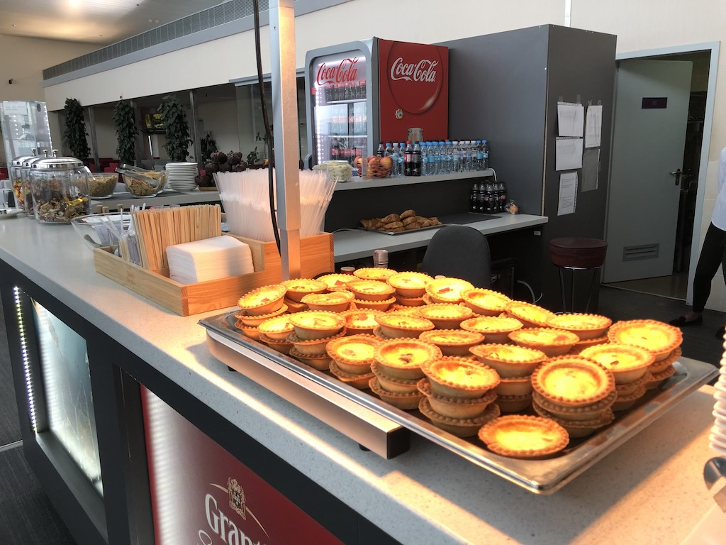 An einer Bar sind kleine Snacks in Form von Sandwiches, Obst und Süßigkeiten aufgestellt. Es war noch morgens und das Angebot entsprach der Frühstückszeit. Neben Pasteten waren auch noch warme Rühreier im Sortiment. Nichts weltbewegendes, aber durchaus ausreichend.