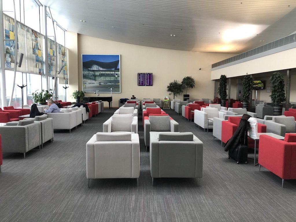 Die Lounge ist ein einzelner grosser Raum mit einer hohen Decke und riesigen Fenstern. Ein Blick auf das Vorfeld ist immer ein Highlight und eine gute Einstimmung auf den Flug. Es war noch nicht viel los, im Laufe der Zeit kamen aber immer mehr Fluggäste und es wurde etwas lebhafter. Dennoch war genügend Platz für alle, zum Sitzen gab es Sessel, Sofas und Drehstühle in einem kleinen getrennten Büroraum.