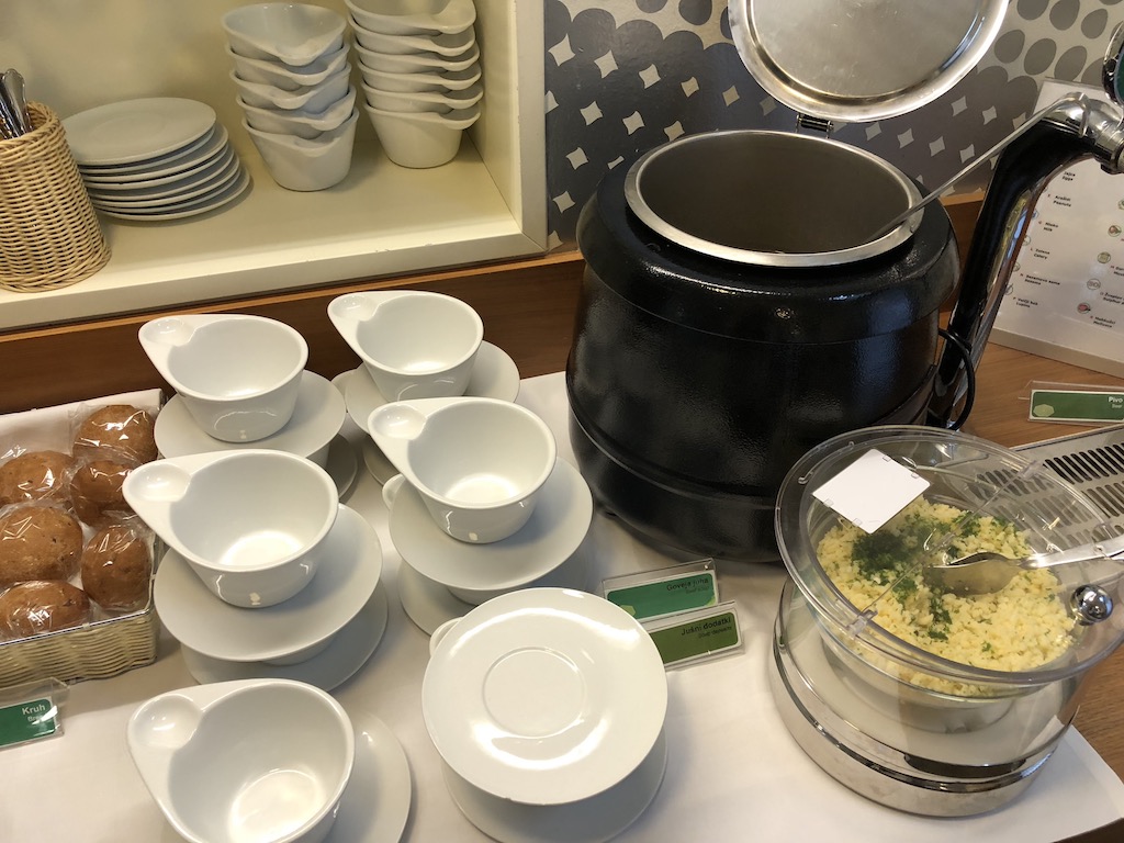 Wir besuchten die Lounge lediglich für rund 20 Minuten zur Mittagszeit und verschafften uns einen schnellen Überblick. Im Speisebereich der Lounge stehen Chips und Salzstangen auf den Tischen. Am Buffet stand Suppe, eine Auswahl an kleinen Salaten, abgepackte Sandwiches sowie Käse bereit. Zusätzlich standen einige Kekse und Gebäck, vermutlich vom Frühstück zur freien Verfügung. Obst, darunter Äpfel, Bananen und Birnen, stand ebenfalls bereit.