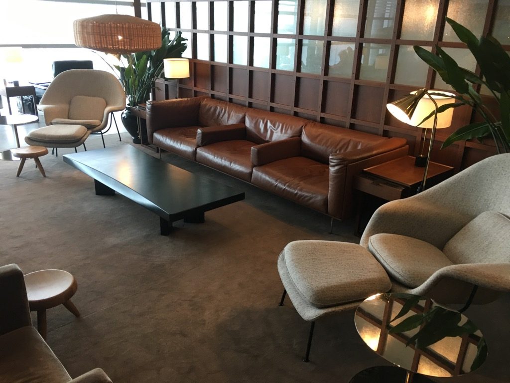 Weiter hinten befindet sich dann der eigentliche Loungebereich der Cathay Pacific Business Lounge London Heathrow. Dieser ist, mit seinen verschiedenen Sitzgruppen sehr wohnlich eingerichtet und wirkte trotz der dunklen Farben nicht düster, was besonders an den großen bodentiefen Fenstern zum Vorfeld liegt, durch welche man viel Tageslicht in der Lounge hat.
