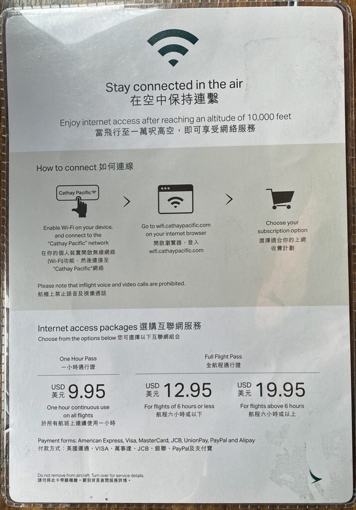 Ich hatte das Glück, dass ich in einer modernisierten 777-300ER fliegen durfte. Bei der Modernisierung wurde das Entertainmentsystem verbessert und WiFi eingeführt. Zum Hörgenuss auf dem Flug bekommt man Noise Cancelling Kopfhörer von Cathay Pacific gereicht. Dabei handelt es sich um gebrandete Bose QC25. Diese kenne ich bereits, daher habe ich sie versiegelt zurückgehen lassen und habe meine eigenen Kopfhörer genutzt (Bose QC35).