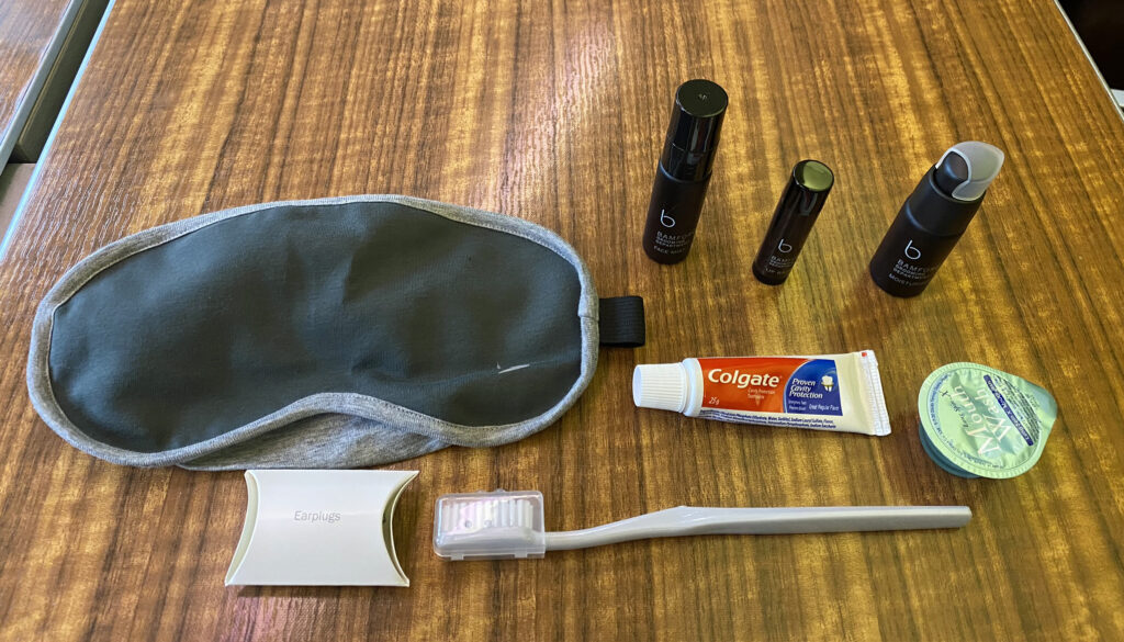 Das Ledermäppchen des Amenity Kits hat mir sehr gut gefallen. Der Inhalt aus generischer Zahnbürste, Zahnpasta, Mundspülung und Ohrstöpseln. Ist da schon enttäuschend. Die Cathay Schlafmaske hat zwar eine bessere Qualität als die, die man oft in der Business Class bekommt, aber rausreißen kann sie da nichts. Die Bamford Artikel Lippenbalsam, Gesichtscreme und Feuchtigkeitsspray haben mich auch nicht begeistert. Da bieten andere Airlines mehr.