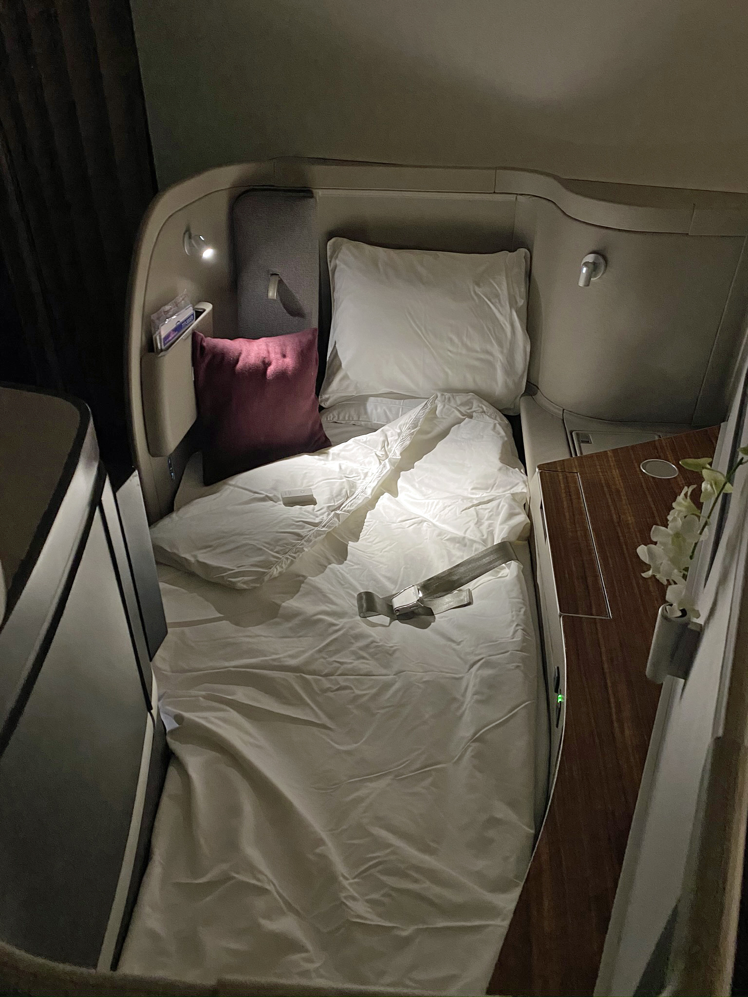 Das Bett ist mit einer Länge von über zwei Metern schön lang. Die Breite von ca. 90 cm hat man leider nur an den Schultern, was ich jedoch nicht unangenehm fand. Ich habe so gut und so tief geschlafen wie selten in einem Flugzeug. Das Matratzenpad hat genau die richtige Härte und die Kabine hatte eine für mich angenehme Schlaftemperatur. Aus meiner Sicht trumpft Cathay Pacific beim Thema Bett richtig auf.