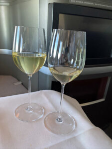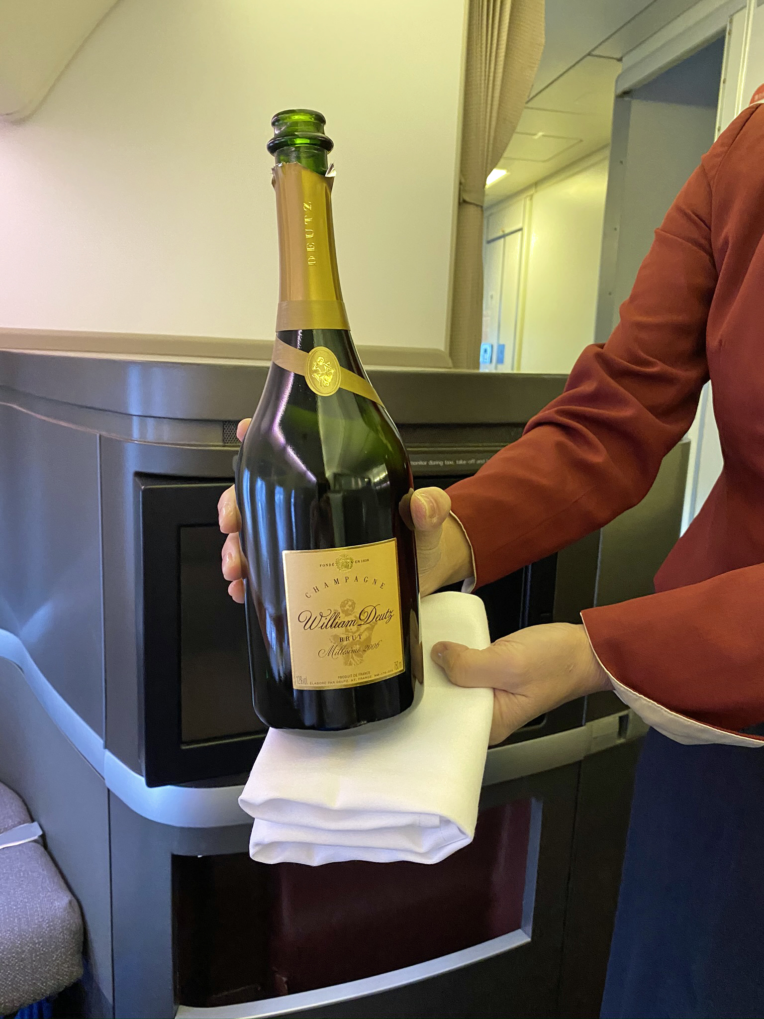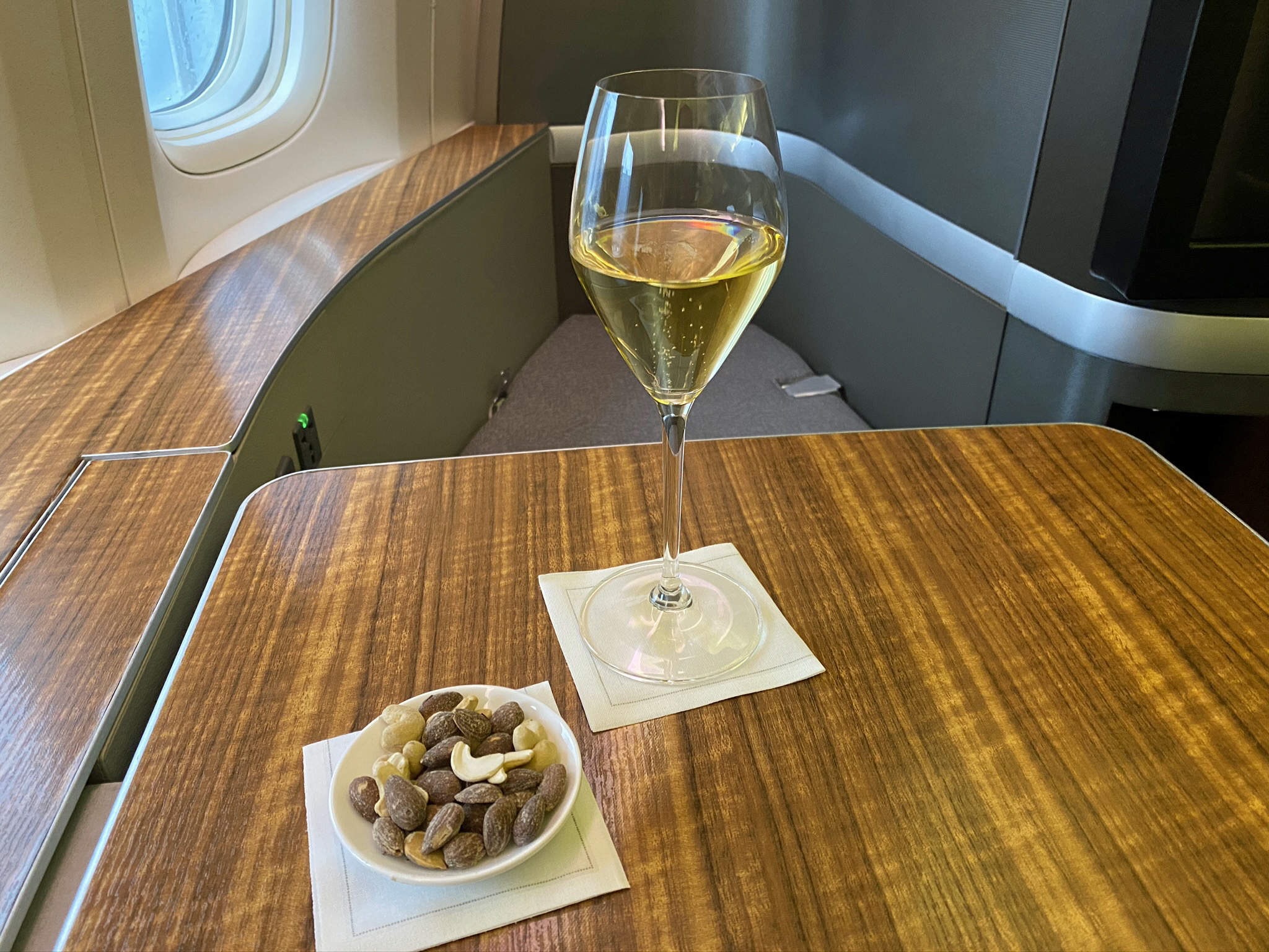 Nach dem ersten Glas Sparkling Tea wurde auch aktiv Champagner angeboten. Auf dem Flug war es „William Deutz Brut Millésimé 2006“. Bei Cathay Pacific gibt es die berüchtigte Champagner-Lotterie, d.h. manchmal gibt’s was richtig Leckeres und andere Male einen Champagner, den man dann halt mal getrunken hat. Zu dem Champagner bestellte ich mir noch ein Glas stilles Wasser und bekam auch noch ein Schälchen warme Nüsse und Mandeln dazu. So vergeht die Zeit bis zum „Boarding completed“ sehr entspannt und genussvoll.