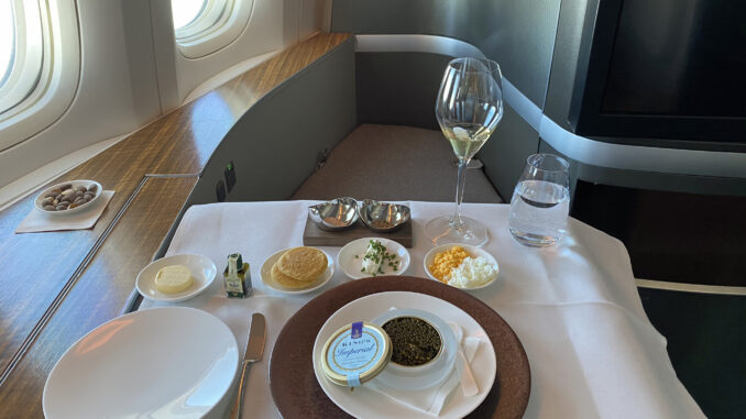 Ungefähr 20 Minuten nach dem Start begann der Essensservice – natürlich mit einem Glas Champagner, das ich zur Begleitung des Kaviars (20g) nutzen durfte. Beim Caviar serviert Cathay ein Cuvée aus zwei verschiedenen Kaviarsorten. Damit wird die Airline auf der Puristenskala nicht sehr weit oben landen, aber geschmacklich fand ich ihn in Ordnung. Die Präsentation mit Blinis, Perlmuttlöffel und den weiteren Zugaben fand ich ansprechend.