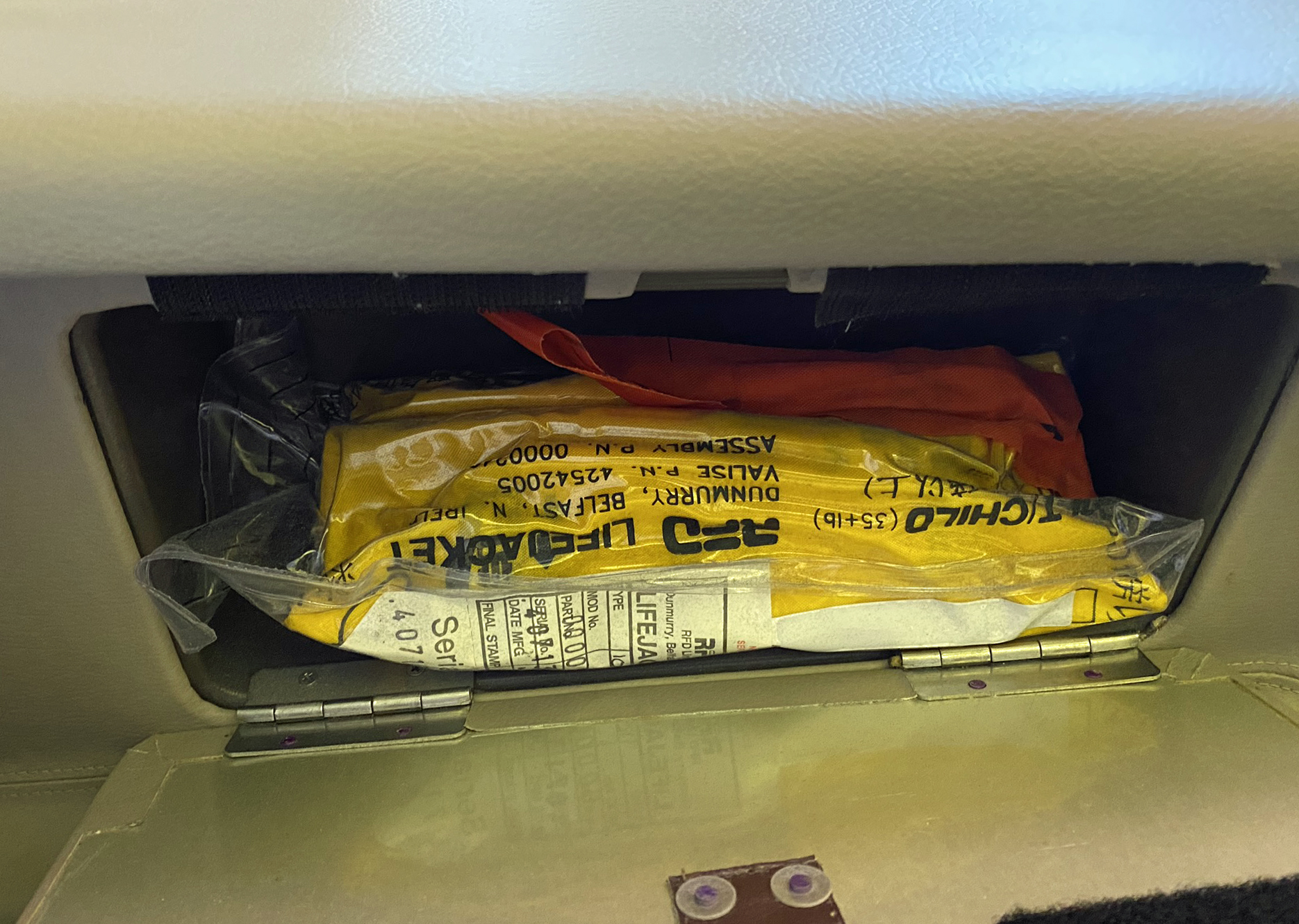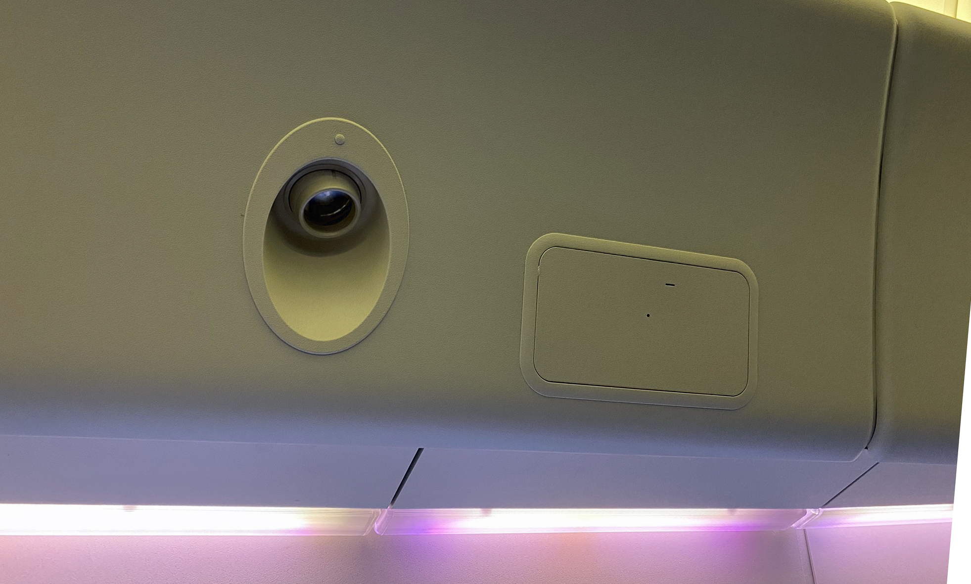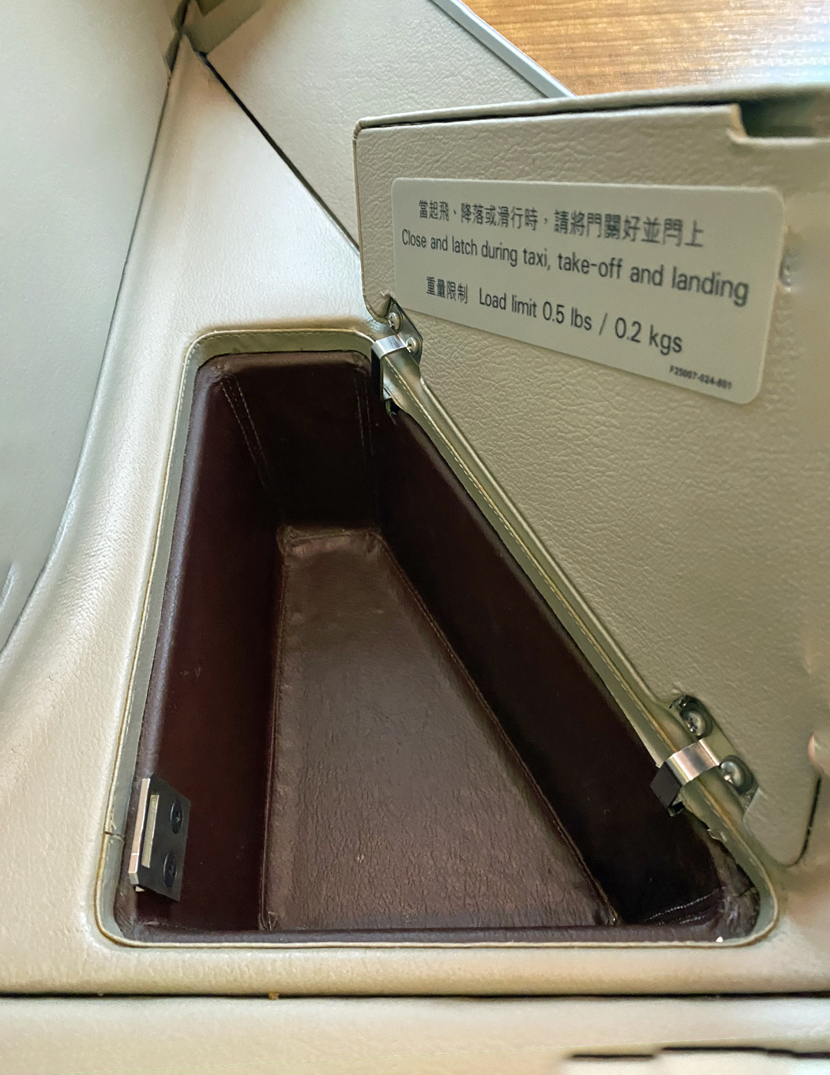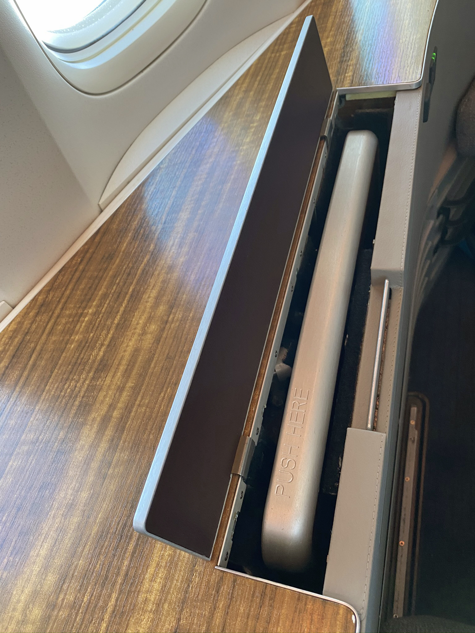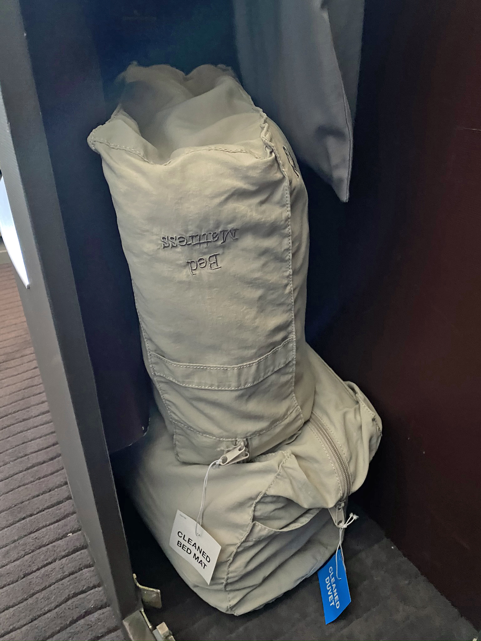 Da es keine Overhead Bins gibt, muss das mitgebrachte Gepäck anderweitig verstaut werden. Hinter dem Monitor (wenn er „eingefahren“ ist) befindet sich ein Schrank. Dort können z.B. Jacken, Hemden usw. aufgehängt werden. Außerdem befindet sich die Bettwäsche dort.
