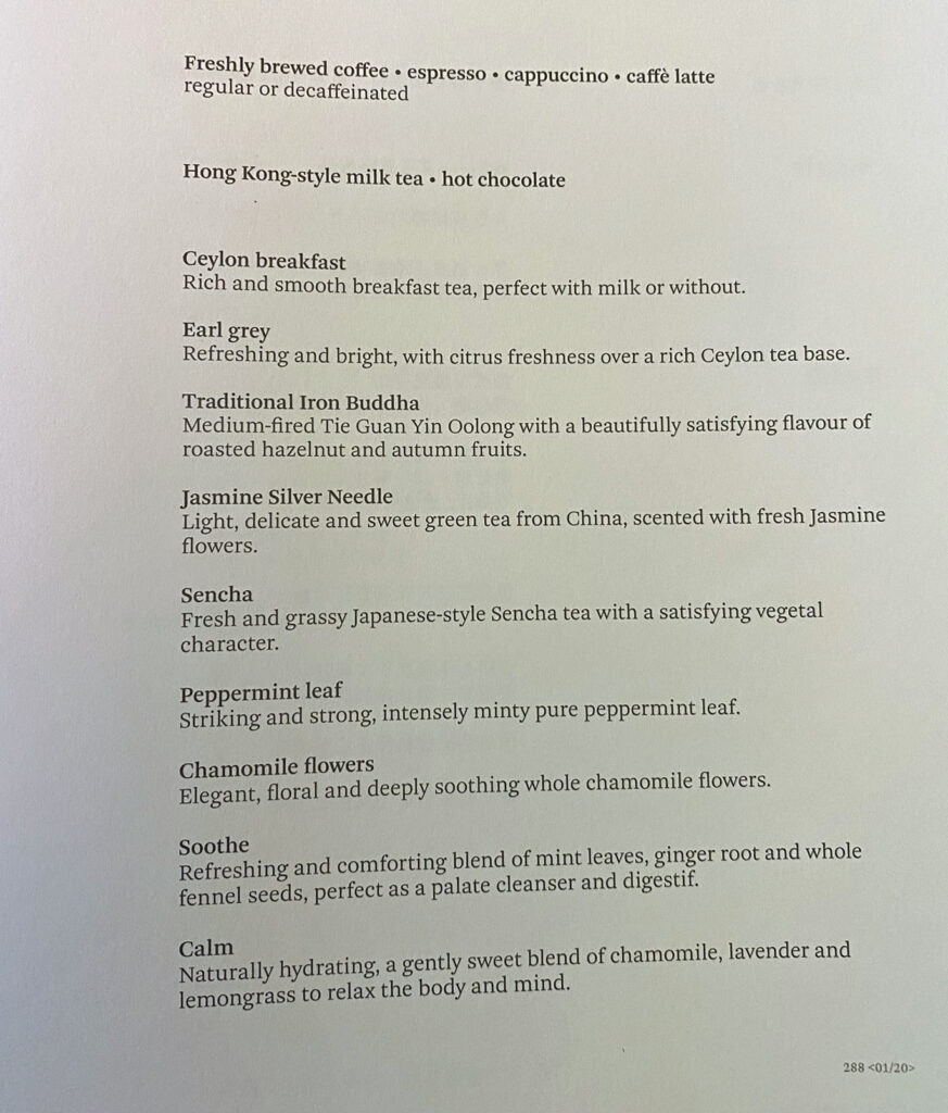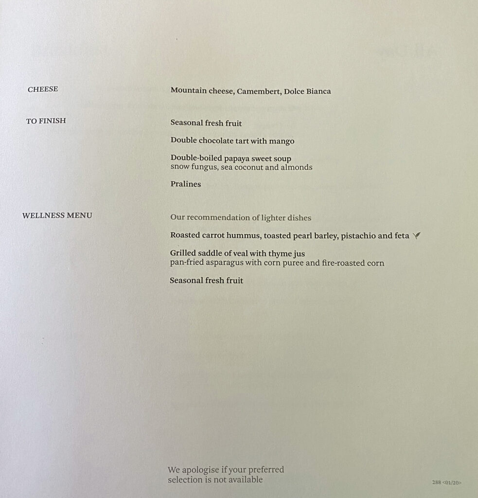 Auf der Strecke Frankfurt – Hong Kong bestellen Gäste das Mittagessen tendenziell früh. Dadurch verbleibt mehr Zeit zum Schlafen bis zur Ankunft in Hong Kong um 6 Uhr morgens. Aus dem Menü darf man in Mix and Match Manier sein Essen zusammenstellen wie man möchte. Solange genug geladen ist, bekommt man es auch serviert.