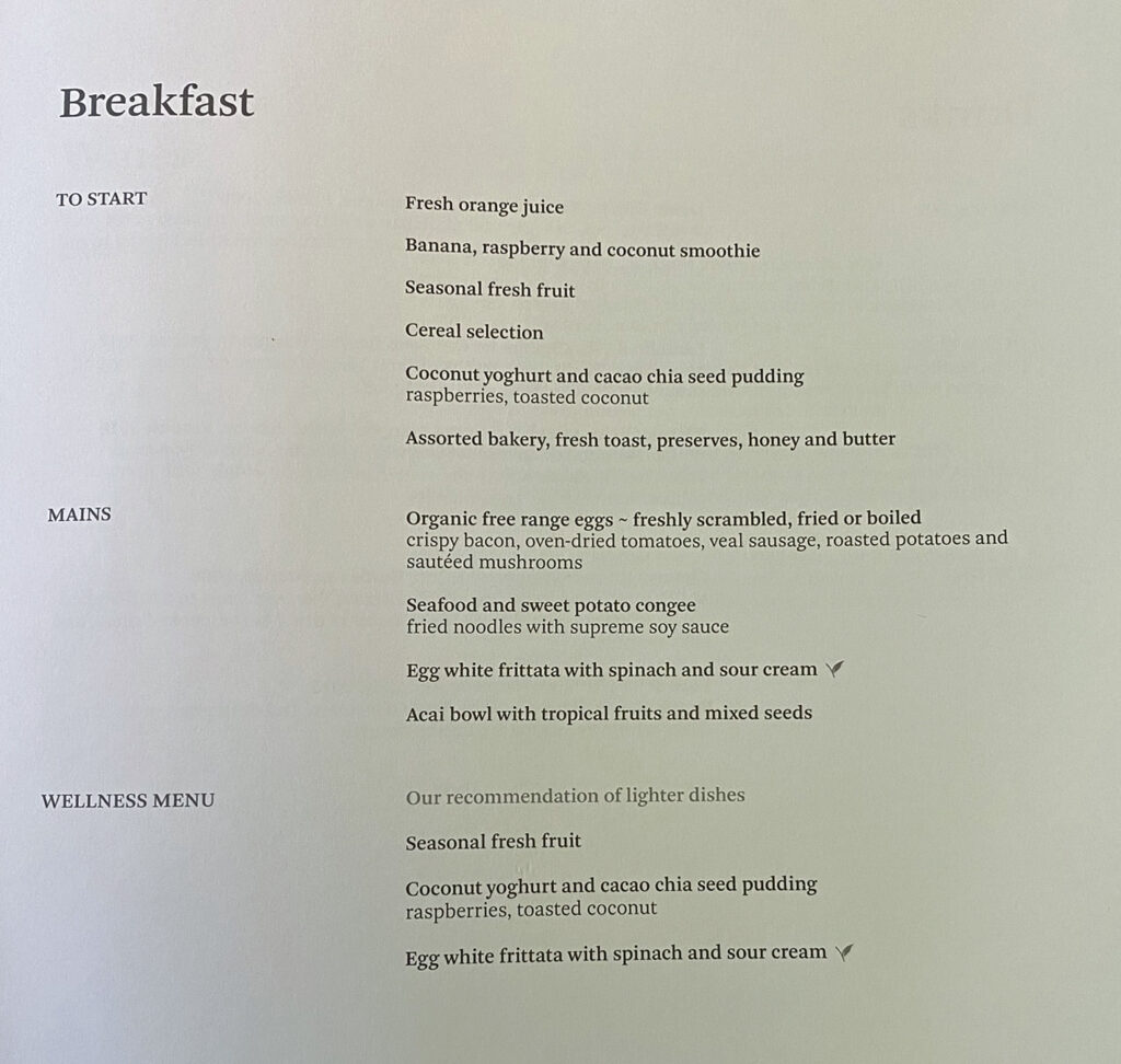 Ein angenehmer Vorteil der First Class bei Cathay ist, dass man das Essen zu einem selbstgewählten Zeitpunkt serviert bekommt. Das Frühstück sollte jedoch mind. 45 Minuten vor der Landung anfangen, da man sonst zu wenig Zeit zum Essen hat (sofern man ein ganzes First Class Frühstück bekommen möchte. Wem eine Tasse Kaffee reicht kann länger schlafen).