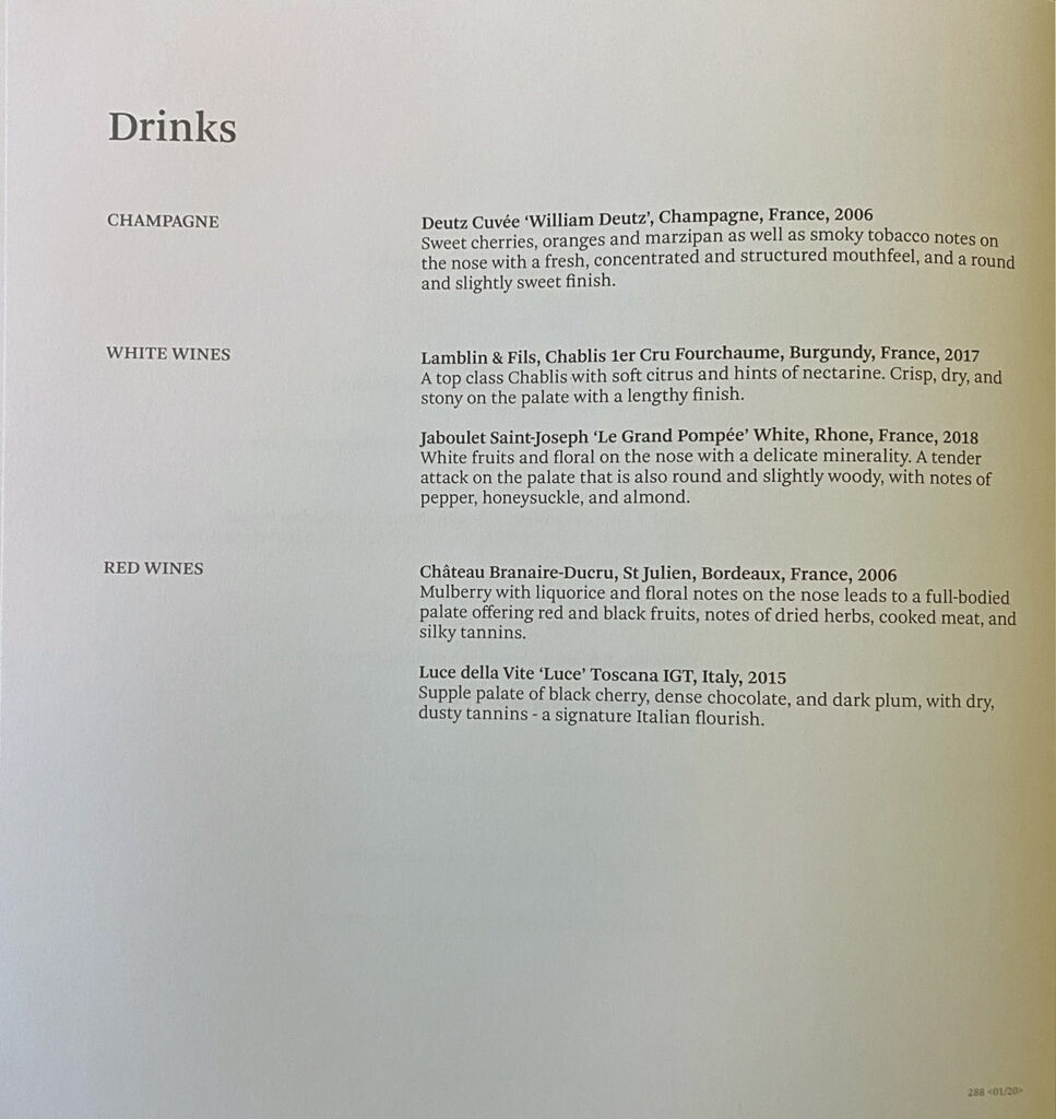 Die Weinauswahl war reichhaltig und abwechslungsreich. Auch wenn kein exorbitant teurer Wein dabei war, scheint mir die Auswahl gut zu sein.