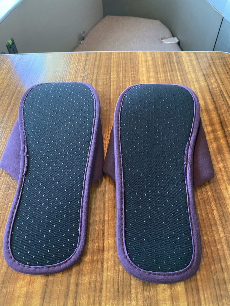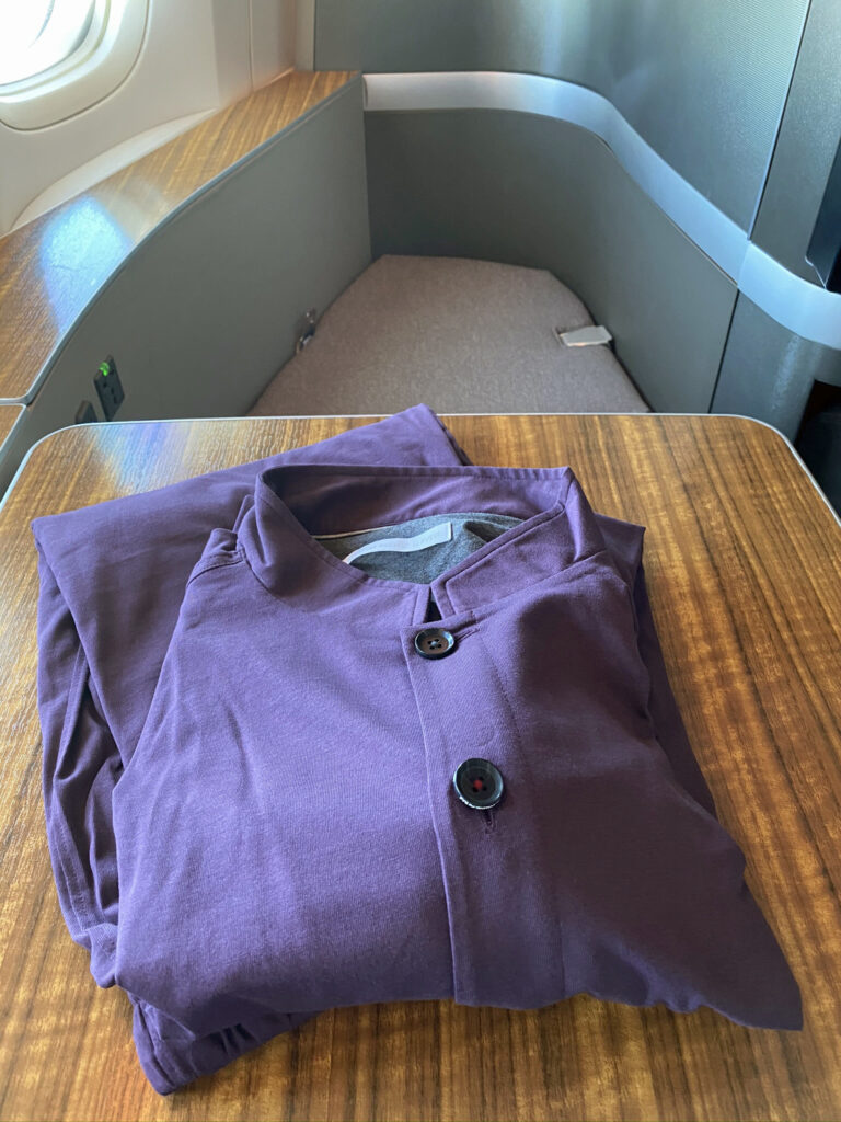 Neben dem Amenity Kit erhalten Gäste der First Class noch Schlappen und einen Schlafanzug. Produzent des qualitativ exzellenten Schlafanzugs ist de Firma PYE. Das Design orientiert sich dabei am Mao Anzug und die Farbe wechselt mehrmals im Jahr. In meinem Fall passte die Farbe des Schlafanzugs zu dem auberginenfarbenen Lederstreifen des Amenity Kits. Die Schlappen sind ebenfalls farblich zum Schlafanzug abgestimmt. Schlafanzug und Schlappen werden in einer versiegelten Stofftasche gereicht, die man ebenfalls behalten und weiterverwenden darf.