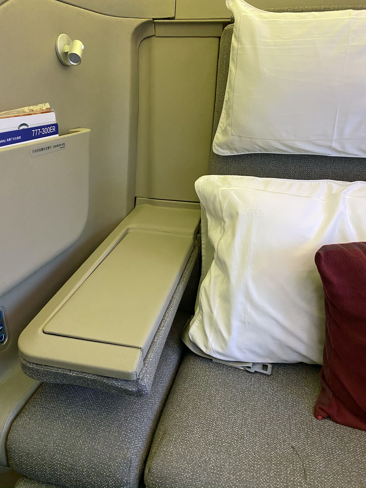 Auf dem unglaublich breiten Sitz (ca. 90 cm) lagen bei meiner Ankunft im Flugzeug 3 Kissen unterschiedlicher Größe und Härte bereit. Der Sitz ist so gebaut, dass sich die Fußablage immer auf der gangabgewandten Seite befindet. Man sitzt also leicht schräg, wenn man seine Füße dort abstellen möchte. Ebenso schläft man schräg, da eben nur dieser vordere Bereich die volle Länge des Bettes (ca. 205 cm) bietet.