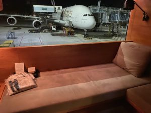 Besonders beeindruckt hat uns hier der Vorfeldblick. Schade fand ich persönlich, dass nur eine ganz dünne Decke gereicht wurde. Die Lounge war sehr gut klimatisiert und ich habe gefroren. Ebenso störend empfanden wir den Geräuschpegel bei den Dayrooms, da sie nur mit einem Vorhang geschlossen sind. Wir haben hier mit hochgelegten Beinen gearbeitet, aber an Schlaf wäre ohne Ohrstöpsel nicht zu denken gewesen.