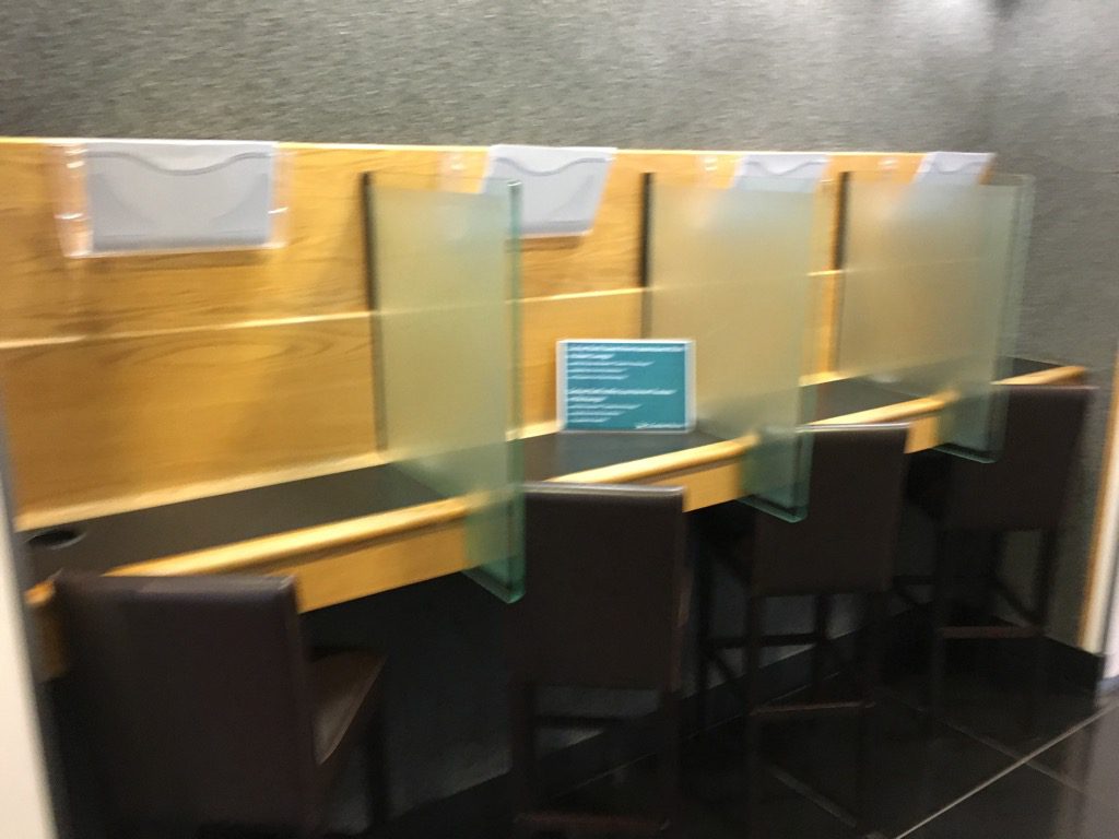 Die Cathay Pacific Lounge Frankfurt besteht im Grunde aus zwei Räumen. Im vorderen Raum befinden sich neben einigen Sesseln, auch Arbeitsplätze mit Steckdosen. Die gesamte Lounge verfügt natürlich auch über kostenfreies WLAN.