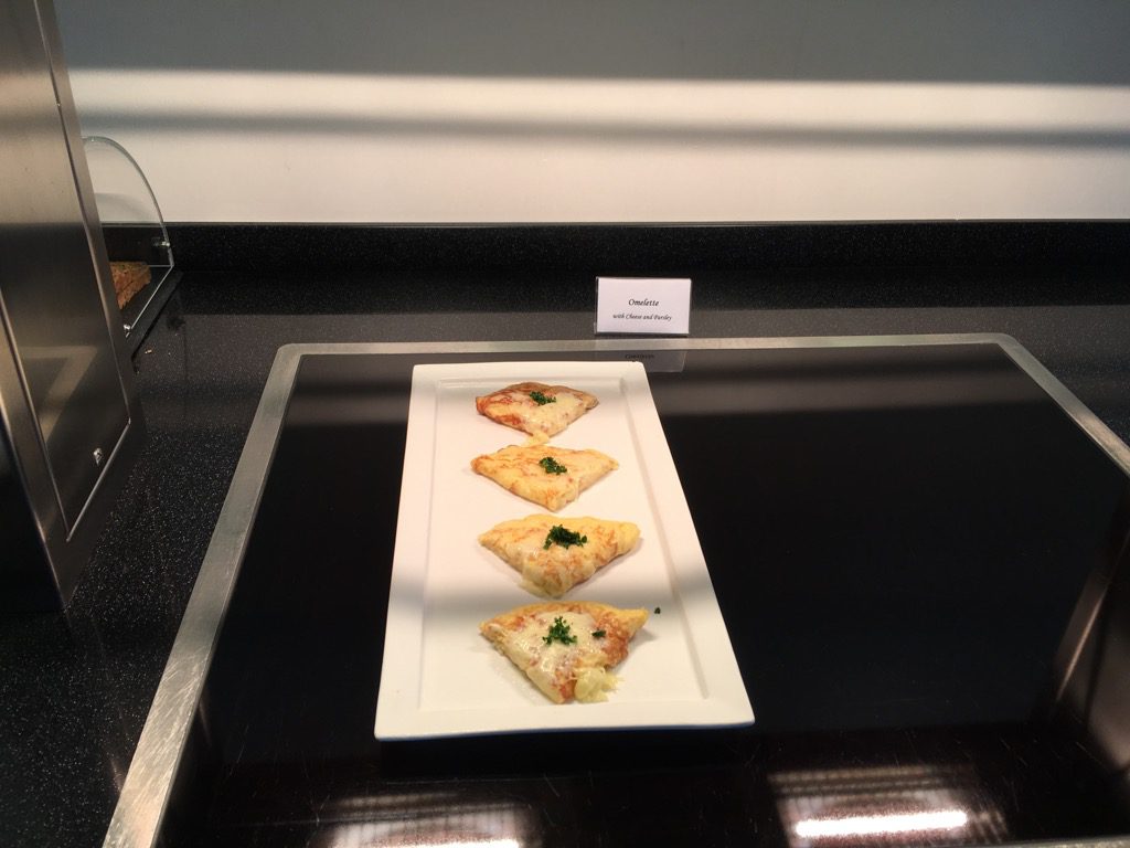 Auf dem Buffet im hinteren Bereich der Lounge wurde Rührei angeboten. Neben Sandwichs und Omeletts waren auch Brötchen, Joghurt und Müsli auf dem Buffet.