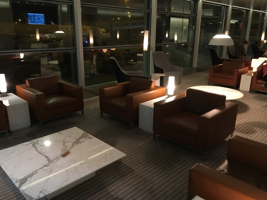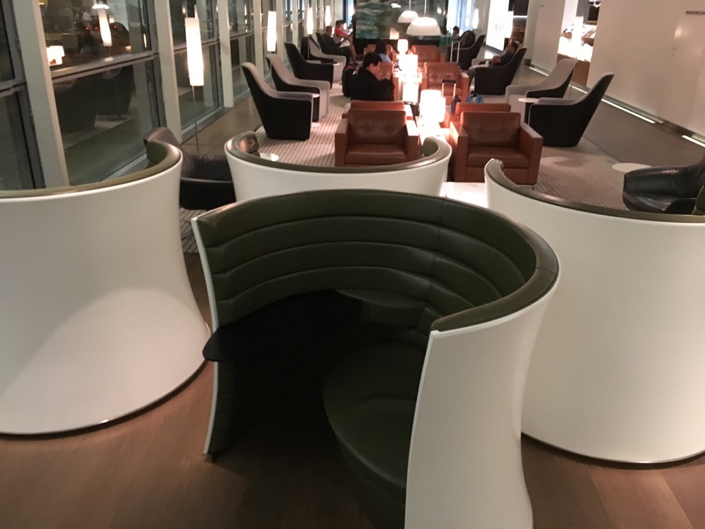 Wenn man nach dem Front Desk nach rechts abbiegt, kommt man zu Beginn in einen ersten Loungebereich, welcher sehr großzügig mit verschiedenen Sesseln in Sitzgruppen ausgestattet ist. Das Design war hier zwar noch nicht das ganz neue Cathay Pacific Lounge Design wie ich es z.B. aus London kannte, dennoch hat es mir sehr gut gefallen.