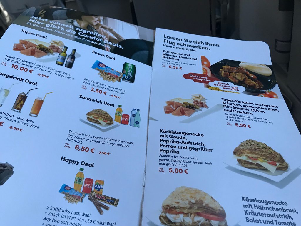 Auf der Kurz- und Mittelstrecke bietet Condor in der Economy Class einen kostenpflichtigen Bordservice an. Preise für Getränke und Speisen finden sich in der Menükarte, die in der Magazintasche im Vordersitz liegt.