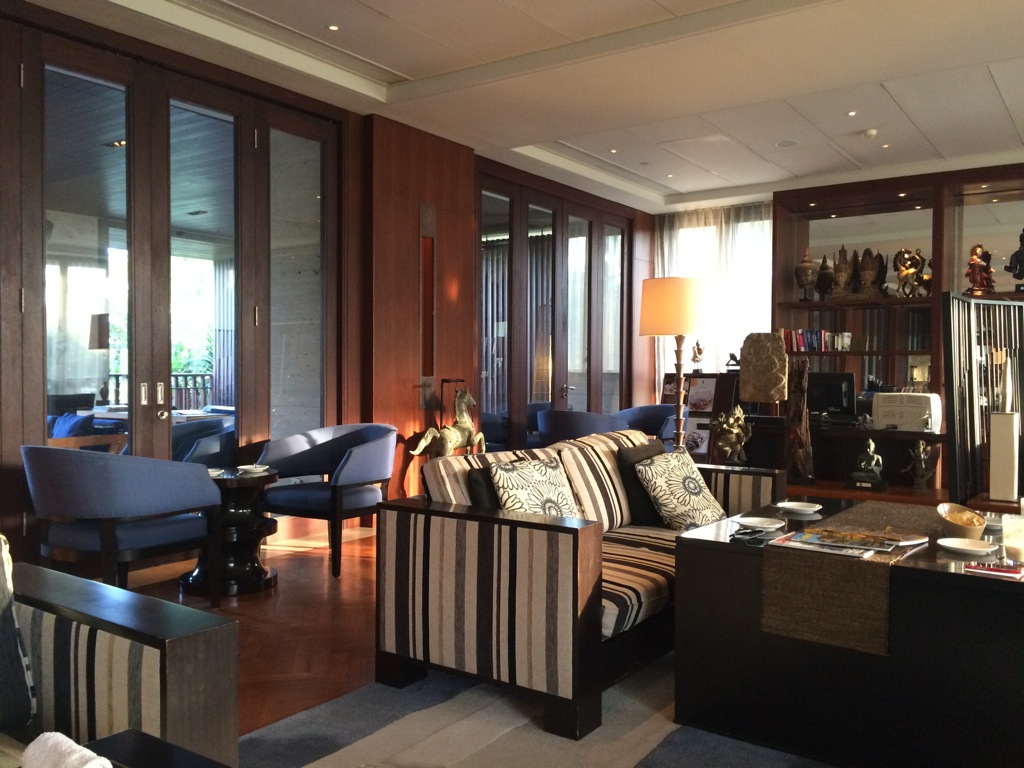 Die Suiten haben eine Größe von 110 qm und wirken dabei sehr großzügig und modern. Man hat bei der Einrichtung immer Wert darauf gelegt, auch den balinesischen Stil mit einzubeziehen. Das Wohnzimmer besteht aus einer kleine Küchenzeile ohne Herd, sowie einem Esstisch. Im hinteren Bereich zu den großen Fenstern hin befindet sich die Couch, ein Sessel sowie natürlich der Fernseher mit DVD Spieler. Das Conrad Bali empfängt übrigens eine Reihe von Pay TV Kanälen, auf welchen man aktuelle Filme und Serien auf Englisch sehen kann.
