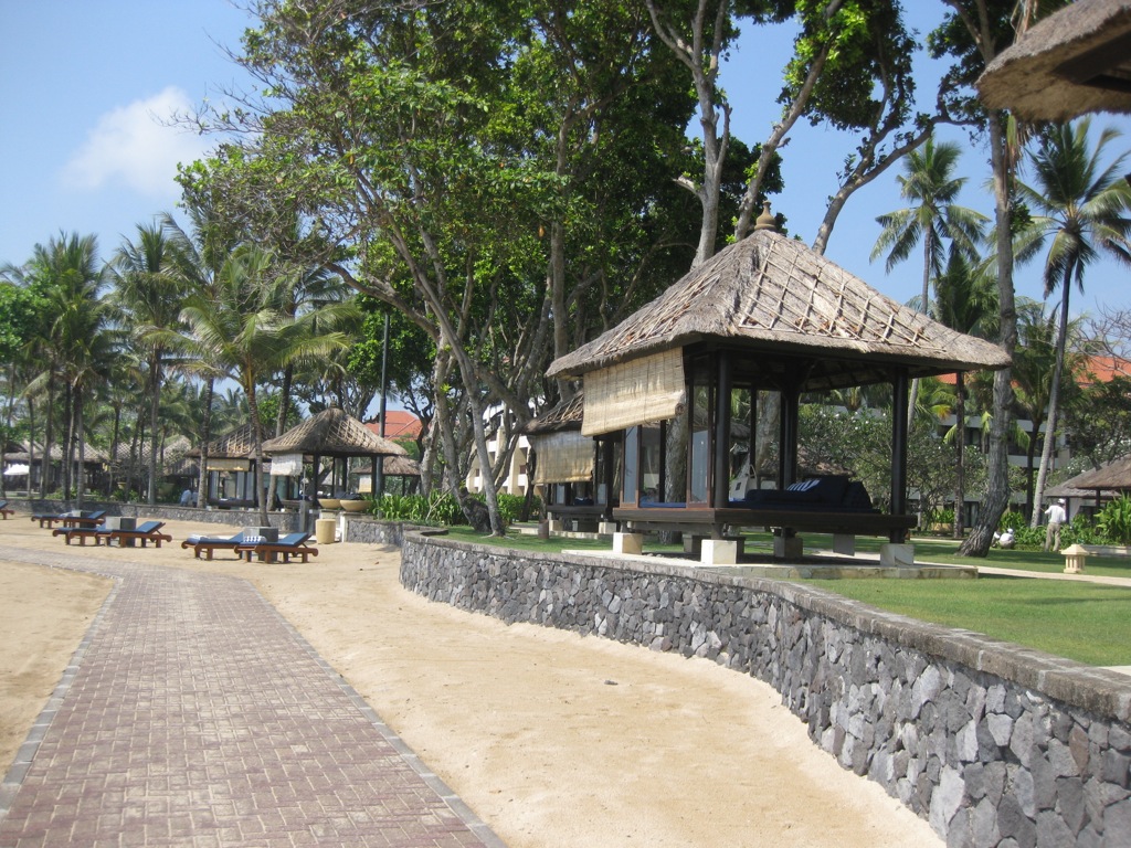 Direkt vor dem Resort befindet sich ein Sandstrand. Dieser wird vom Hotel in einem sehr guten Zustand gehalten. In Bali gibt es grundsätzlich keine privaten Strände. Daher kann es sein, dass man am Strand von fliegenden Händlern oder Masseurinnen angesprochen wird. Das Hotelpersonal achtet allerdings sehr genau darauf, dass die Gäste nicht belästigt werden. Auch Wasser, Handtücher und Liegen werden vom Hotel am Strand zur Verfügung gestellt.