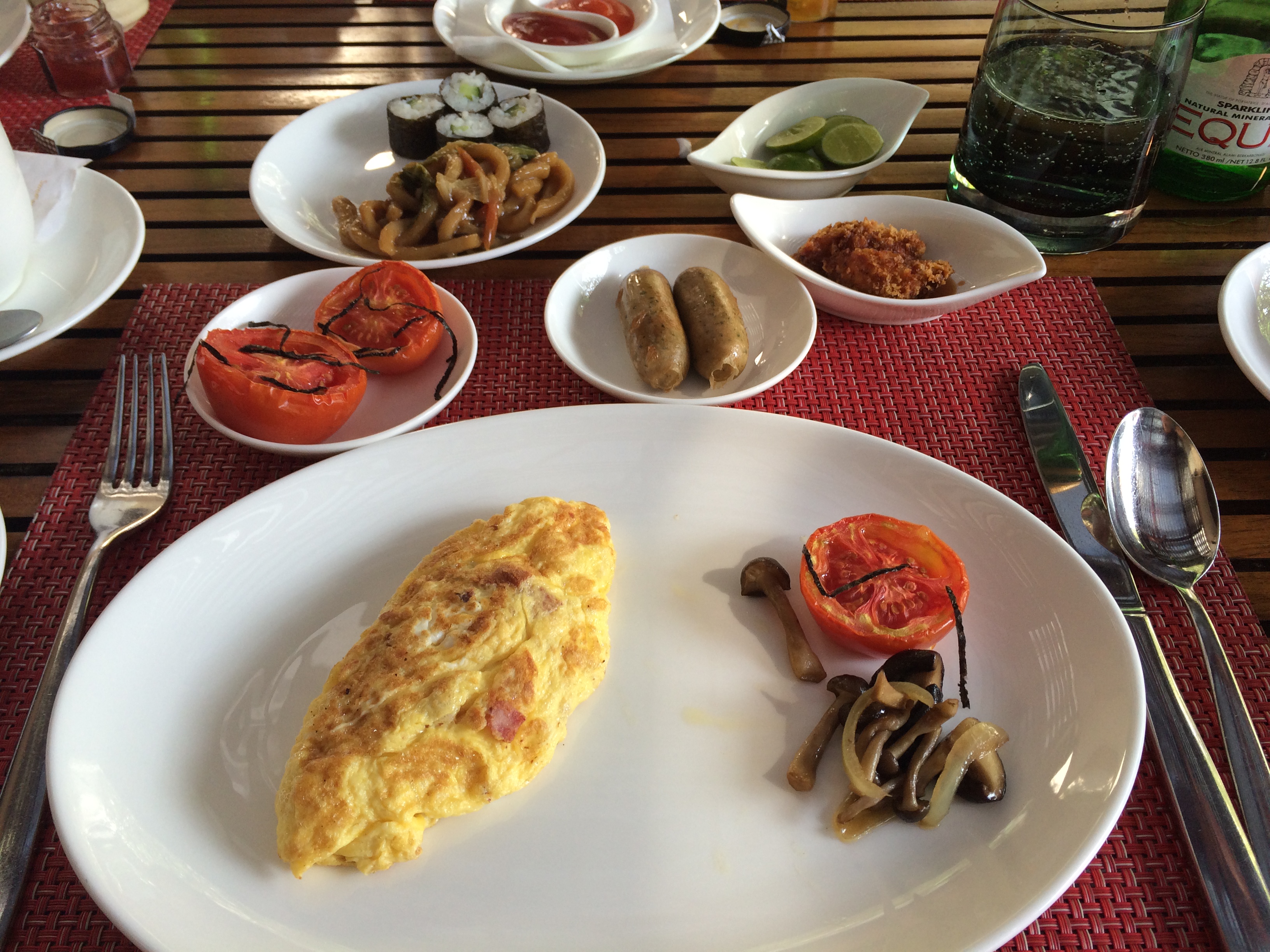 Beim Frühstück wird ein kleines Buffet im Restaurant angeboten. Dazu gibt es eine kleine Karte mit verschiedenen Eierspeisen, Süßspeisen und auch asiatischem Frühstück. Auch Sonderwünsche werden Euch hier sehr gerne erfüllt.