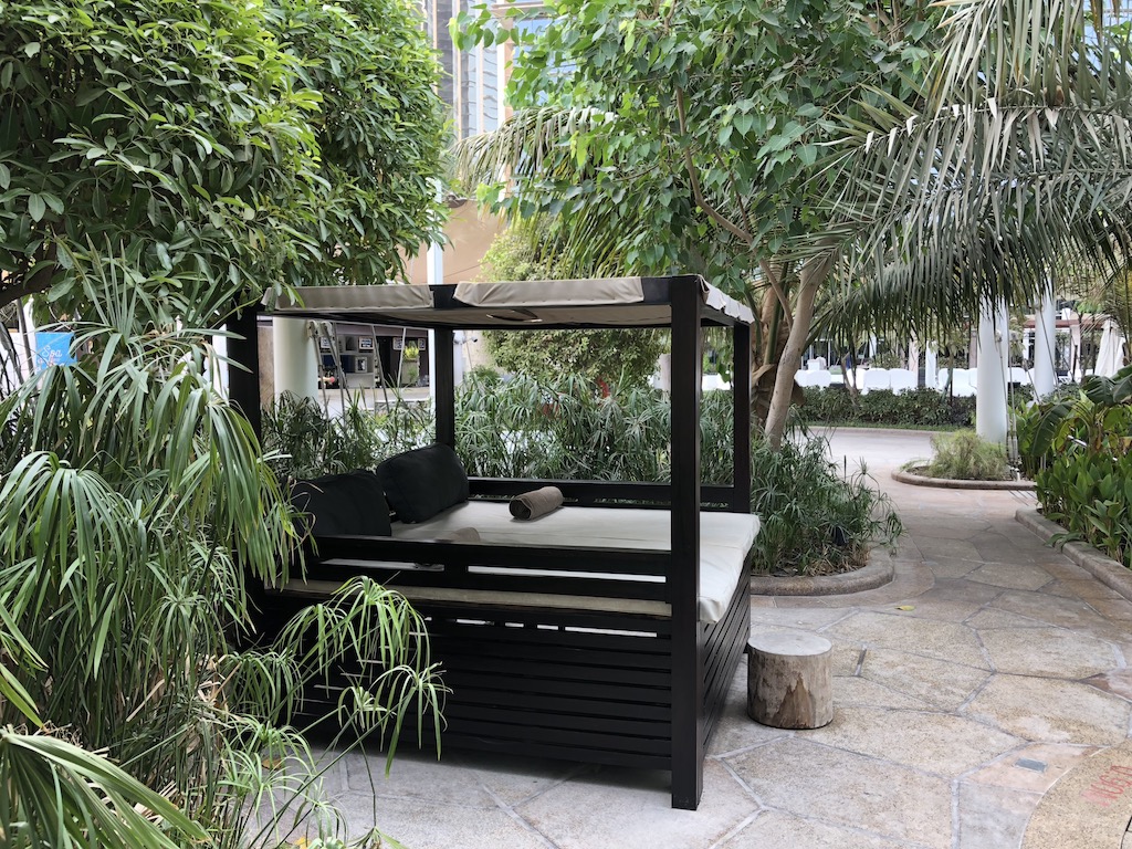 Im Außenbereich befindet sich der schicke Poolbereich mit vielen Sitz- und Liegemöglichkeiten. An der Poolbar wurde in den Abendstunden auch ein BBQ-Buffet aufgebaut. Die Wassertemperatur im Pool war überraschend kühl gehalten und so bestens geeignet für eine Abkühlung von den heißen Lufttemperaturen.