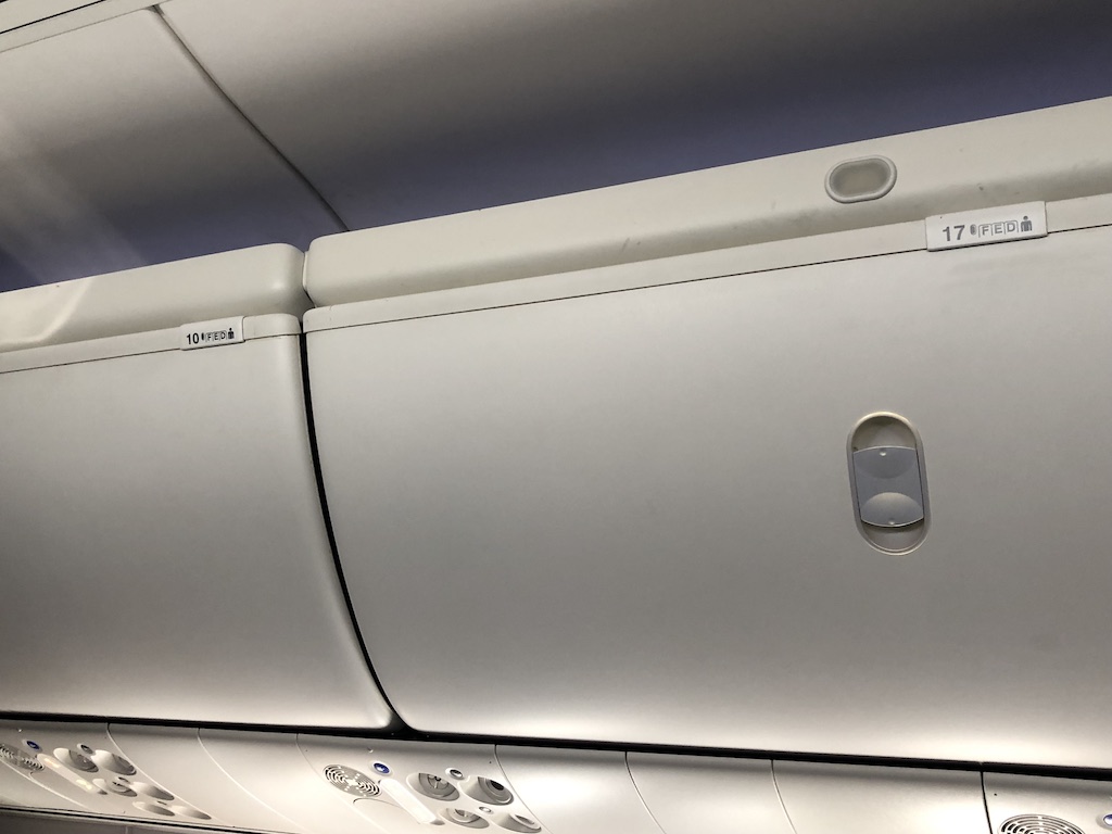 Die Ablagefächer waren bereits prall gefüllt und geschlossen, trotz der Sitze am Notausgang konnten wir unser Gepäck dort auch unter dem Vordersitz verstauen. Normalerweise ist dieser Bereich tabu für Taschen und Koffer, Copa hat hier – wie viele US-Carrier auch – offenbar eine andere Regelung.
