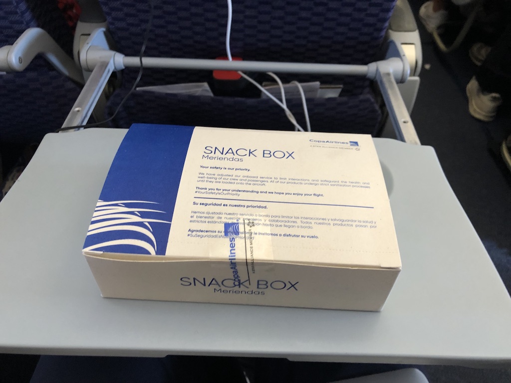 Das Entertainment beinhaltet mehrere Filme und Serien, Audiokanäle, Spiele und Kinderprogramme. Anschließend haben die Flugbegleiter Snackboxen ausgeteilt und Getränke abgefragt. Der Bordservice bei Copa ist in beiden Klassen inklusive und wurde auch auf dem kürzeren Anschlussflug durchgeführt.