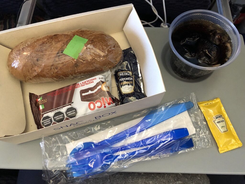 Inhalt waren ein Sandwich mit Senf und Mayonnaise sowie ein abgepackter Kuchen. Beim Abräumen fällt auf wieviel Abfall ein solches Angebot verursacht, insbesondere mit dem nicht wirklich notwendigen Besteck aus Hartplastik.