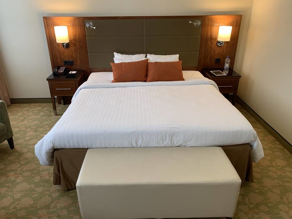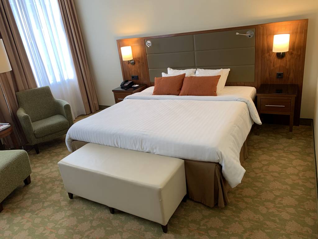Mein Komfort-Zimmer mit King-Bett war etwa 30 qm groß. Es verfügte zusätzlich über einen Schreibtisch und zwei Sessel mit kleinem Esstisch. Über dem Schreibtisch befand sich auch ein Flachbildfernseher und hinter einer der Schranktüren der Kühlschrank. Letzter war nicht befüllt. Für den kleinen Einkauf stand in der Nähe der Rezeption jedoch ein Mini-Shop zur Verfügung.